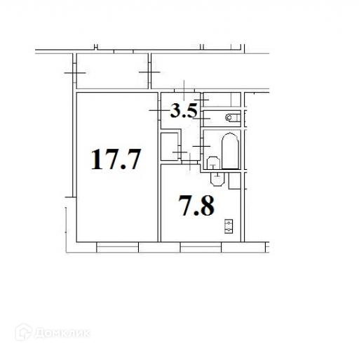 Общая площадь 33.5 кв.м., широкая комната 17.7 кв.м., кухня квадратной формы 7.8 кв.м., сан.узел раздельный, кладовка.