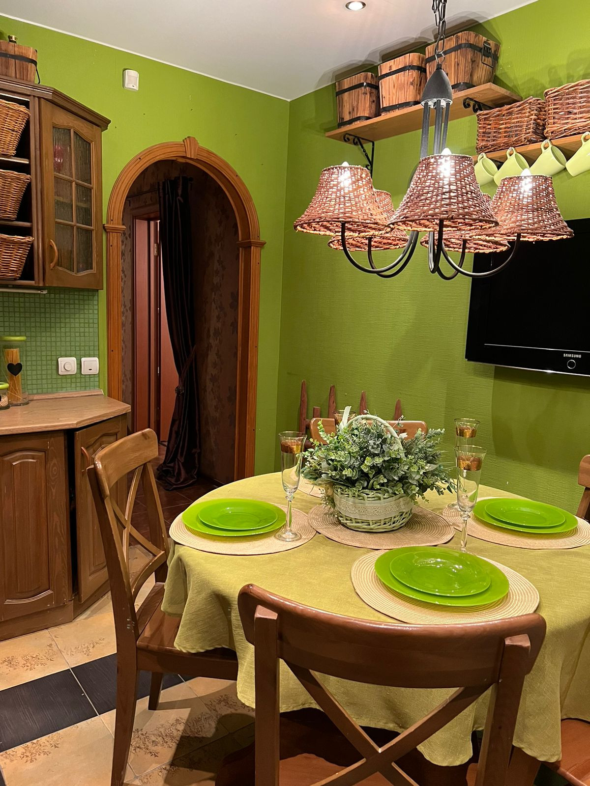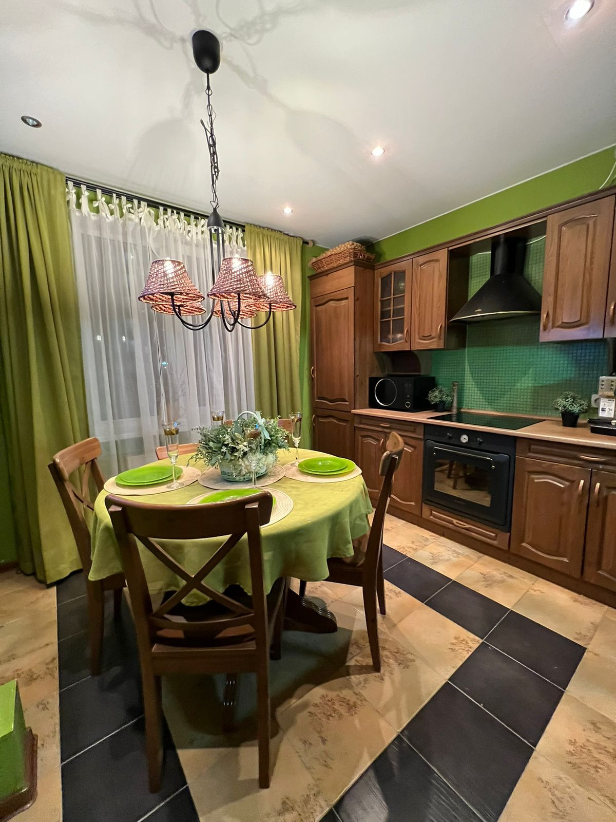Кухня оборудована гарнитуром ( массив сосны) и всем необходимым наполнением и техникой (варочная панель, электрический духовой шкаф , холодильник,стиральная машина). Вся техника остается!