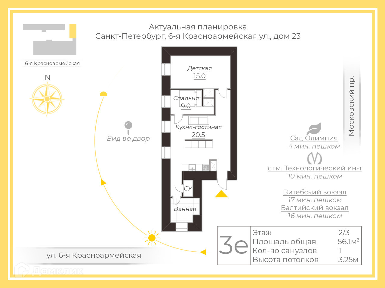 3-комнатная квартира, 56.1 м2, этаж 2 / 3, на продажу в Санкт-Петербурге, 6-я Красноармейская улица, 23