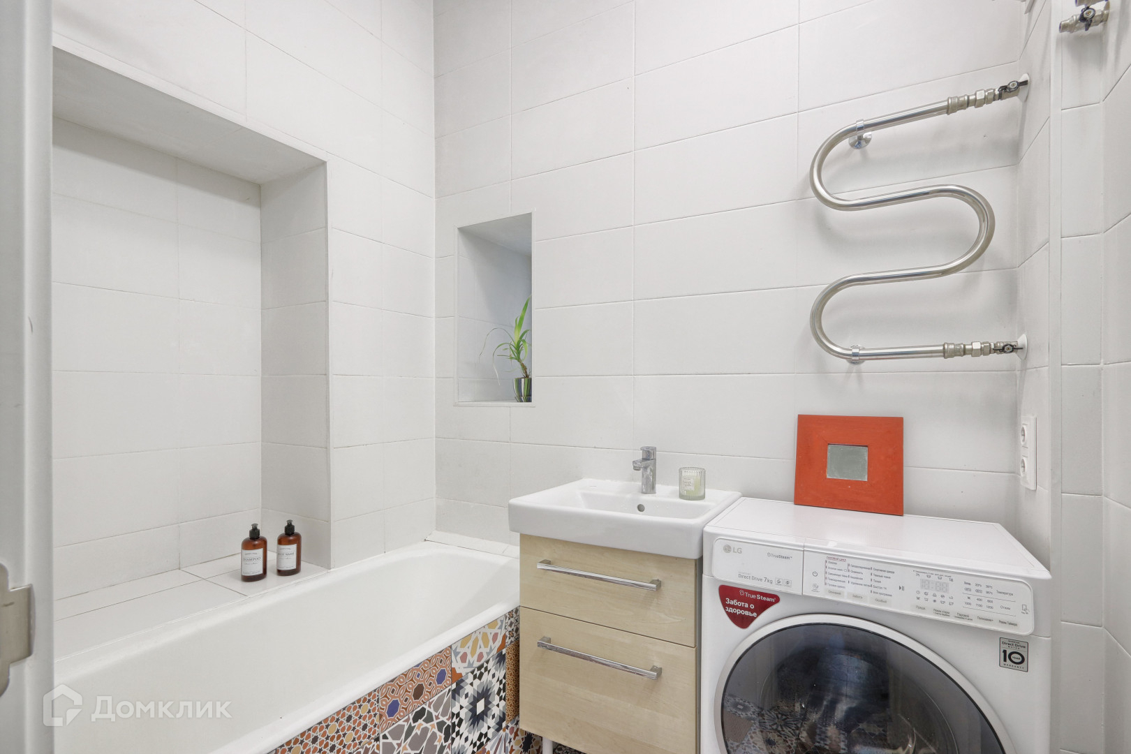 ванная с небольшим окном и теплым полом.