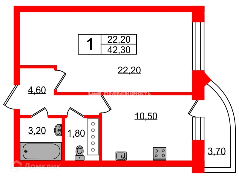 Общая площадь 42.3 м2
