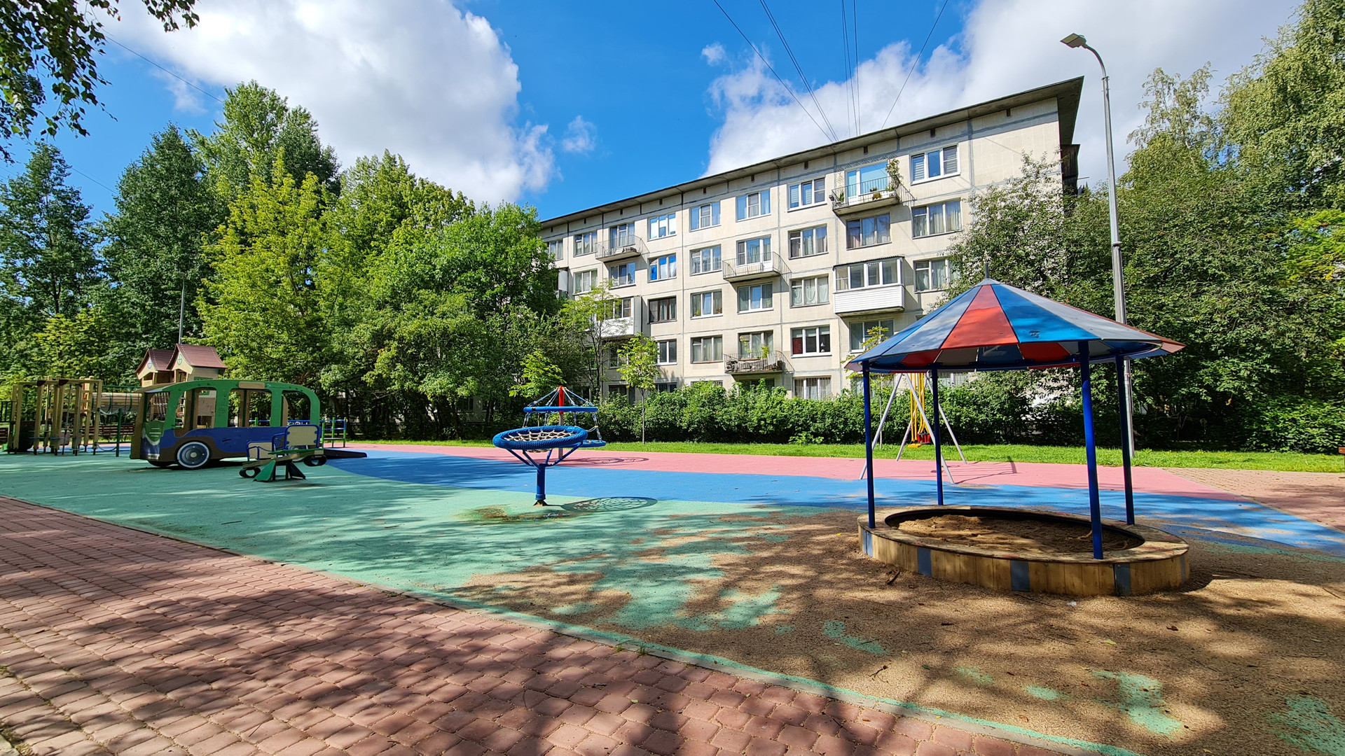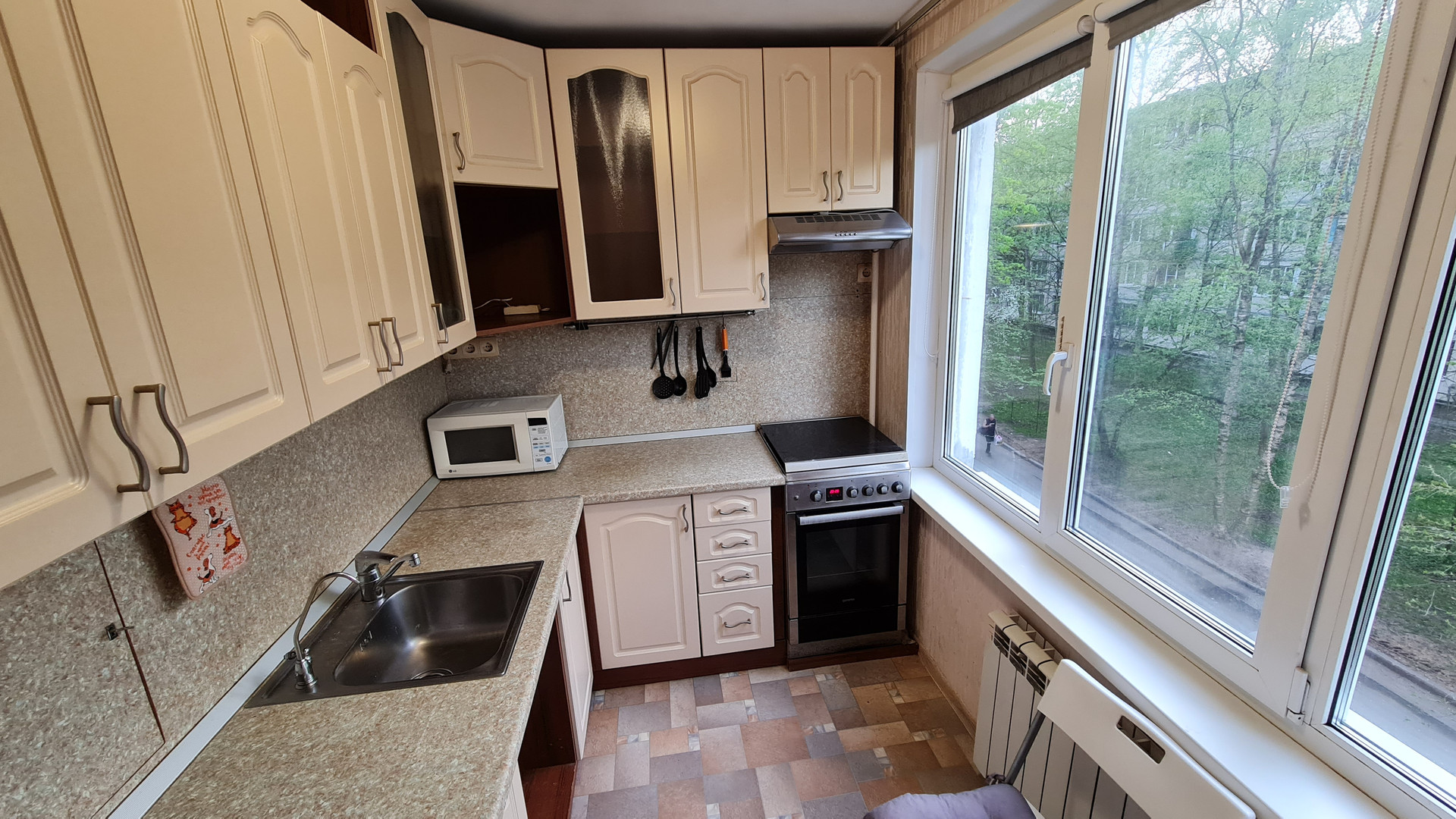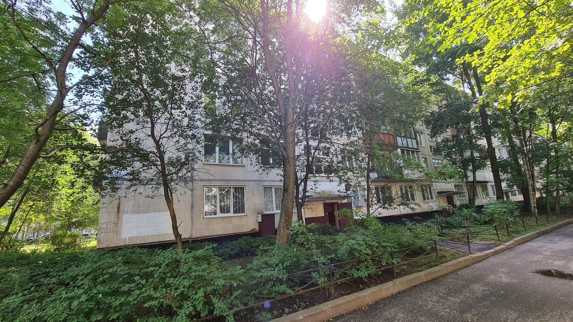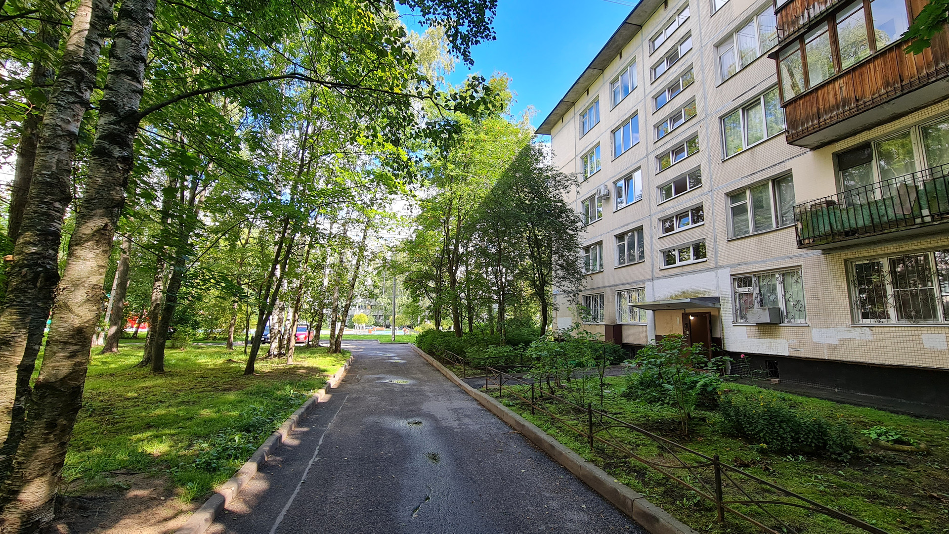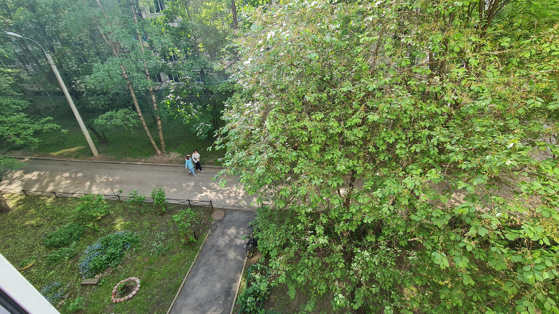 Под окнами большая зеленая зона, много деревьев и кустарников.