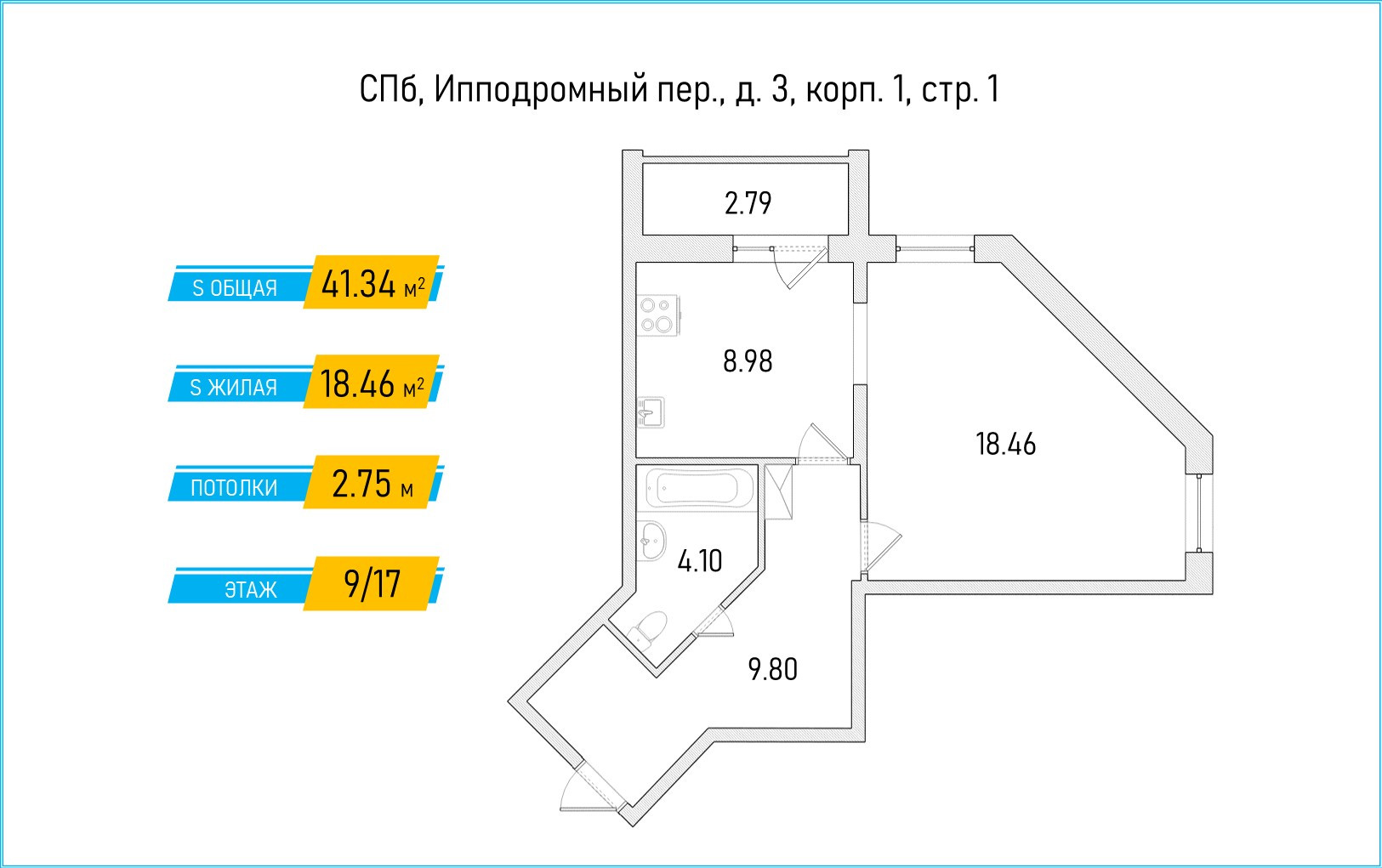 1-комнатная квартира, 41.34 м2, этаж 9 / 17, на продажу в Санкт-Петербурге, Ипподромный переулок, 3к1