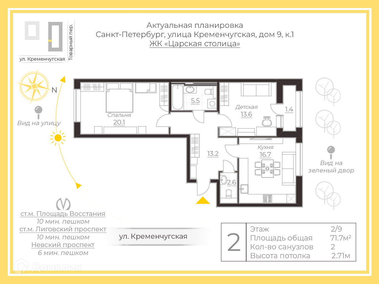 2-комнатная квартира, 71.7 м2, этаж 2 / 9, на продажу в Санкт-Петербурге, Кременчугская улица, 9к1