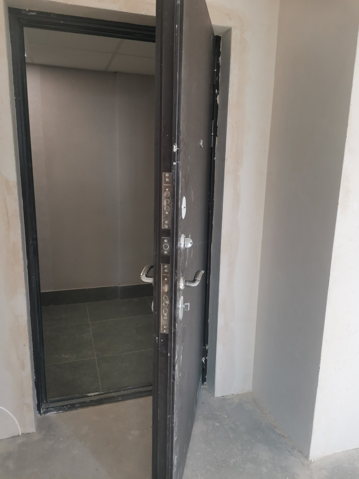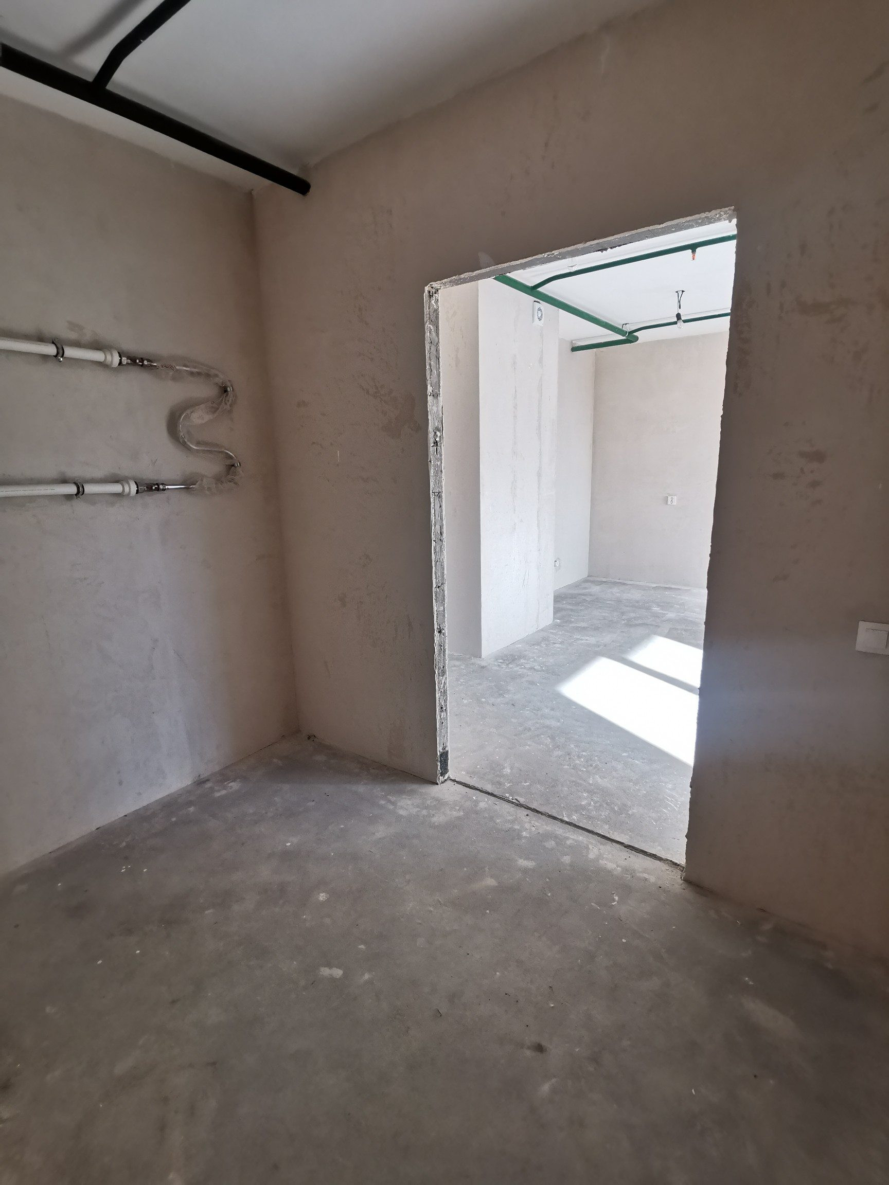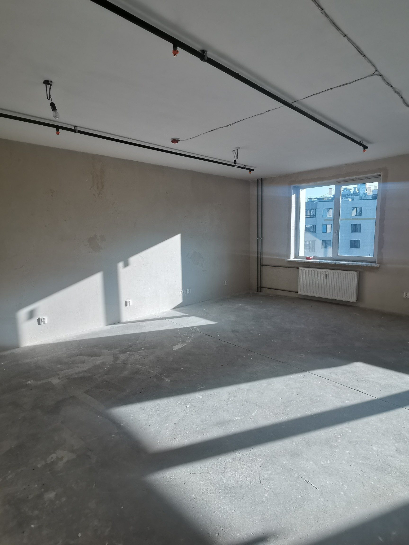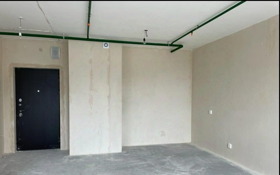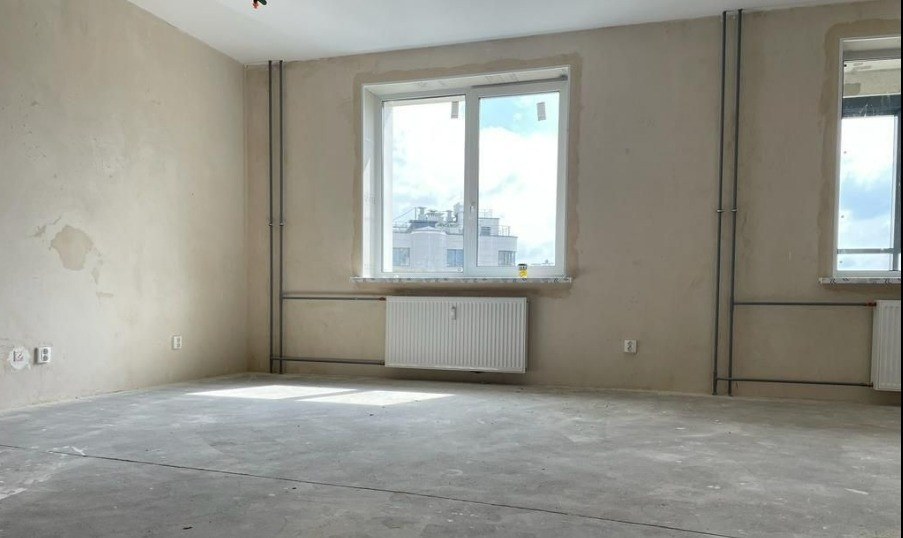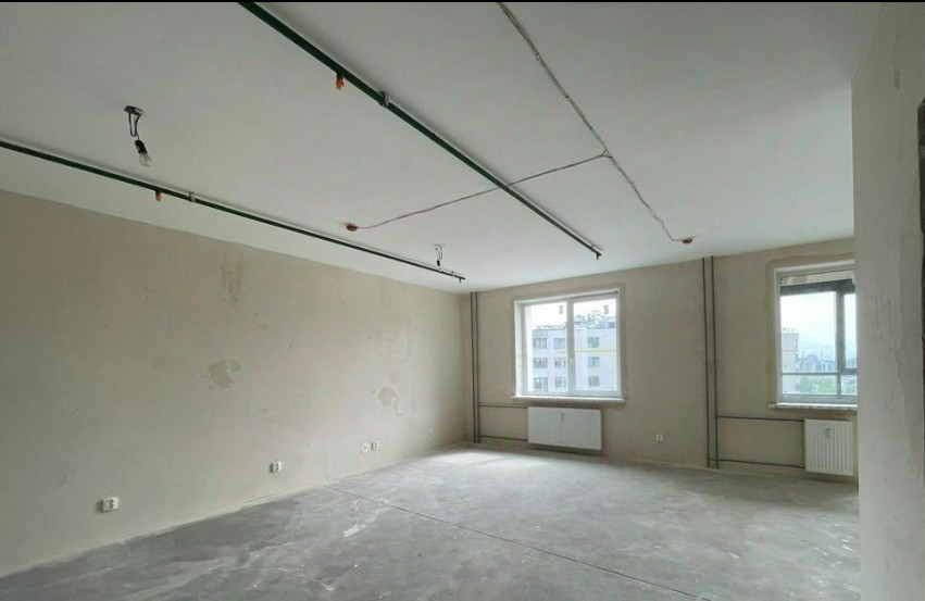 Отделка подчистовая, что очень удобно, ведь все грязные и шумные работы уже выполнены, и в то же время не надо ничего переделывать и ломать. На полу гидроизоляция, стены отшпатлеваны, потолок побелен, установлены подоконники.