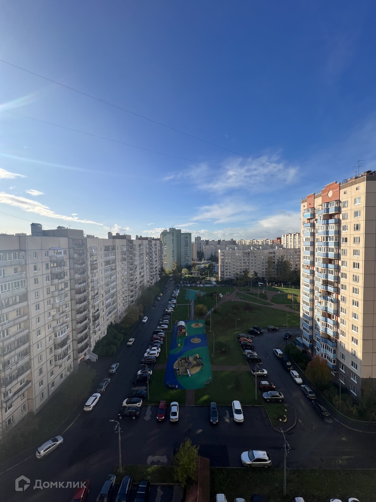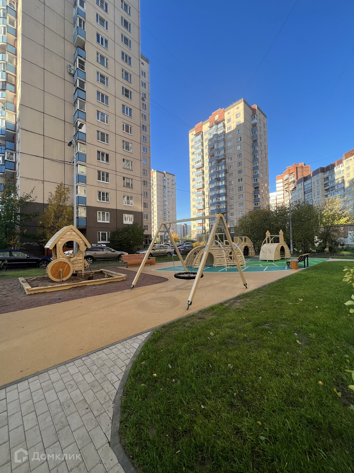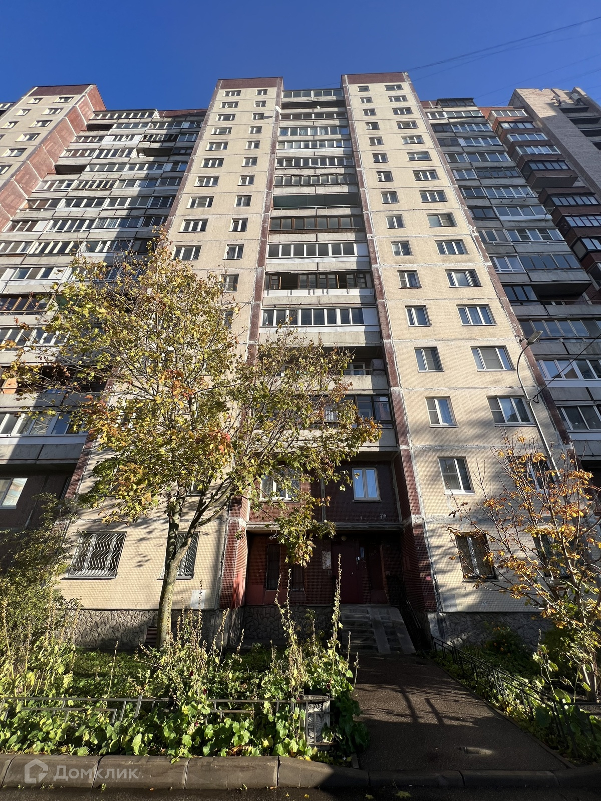 Дом улучшенной 137 серии. Выход из парадной в благоустроенный двор с оборудованными площадками и на Рыбацкий проспект.