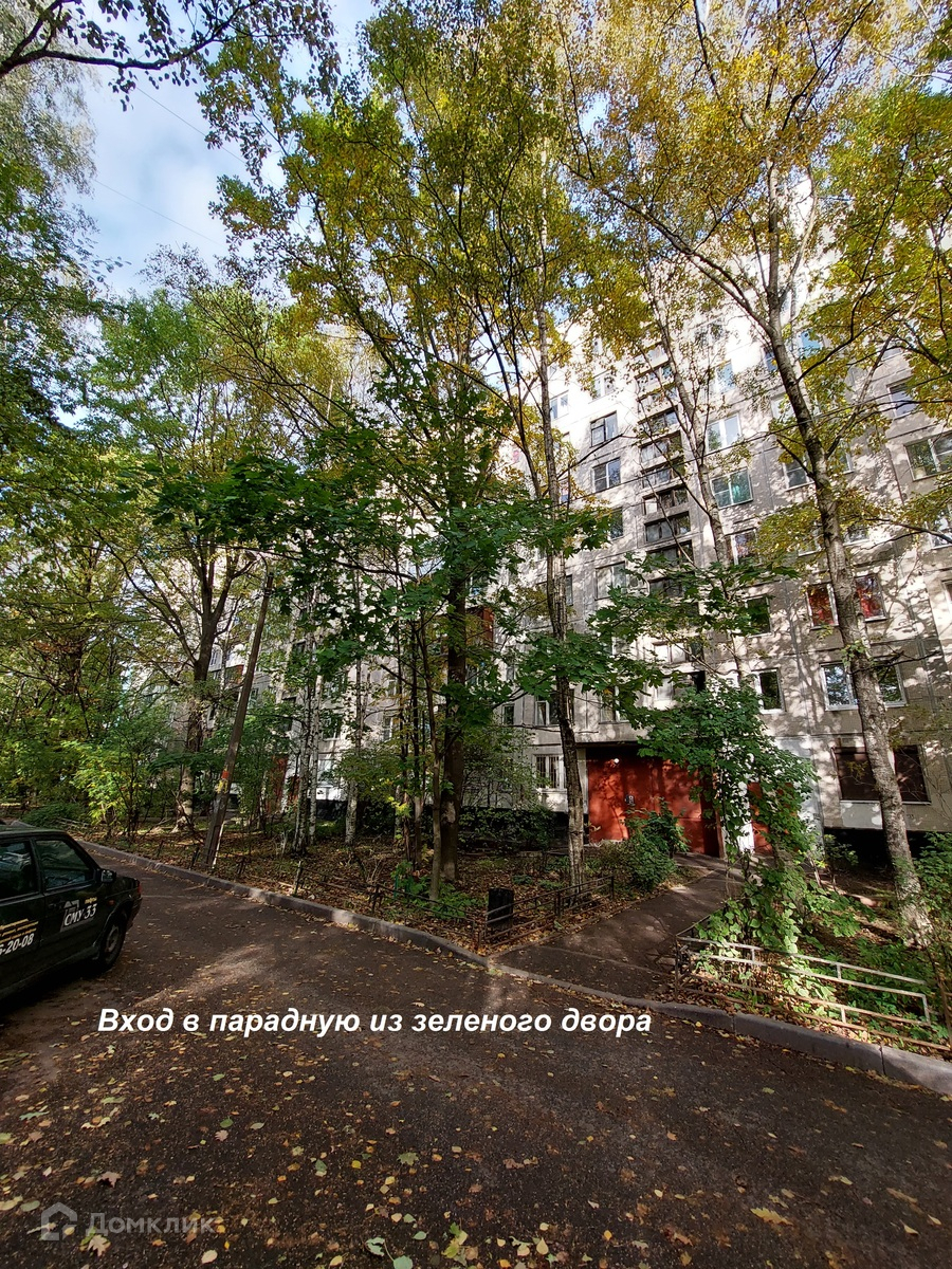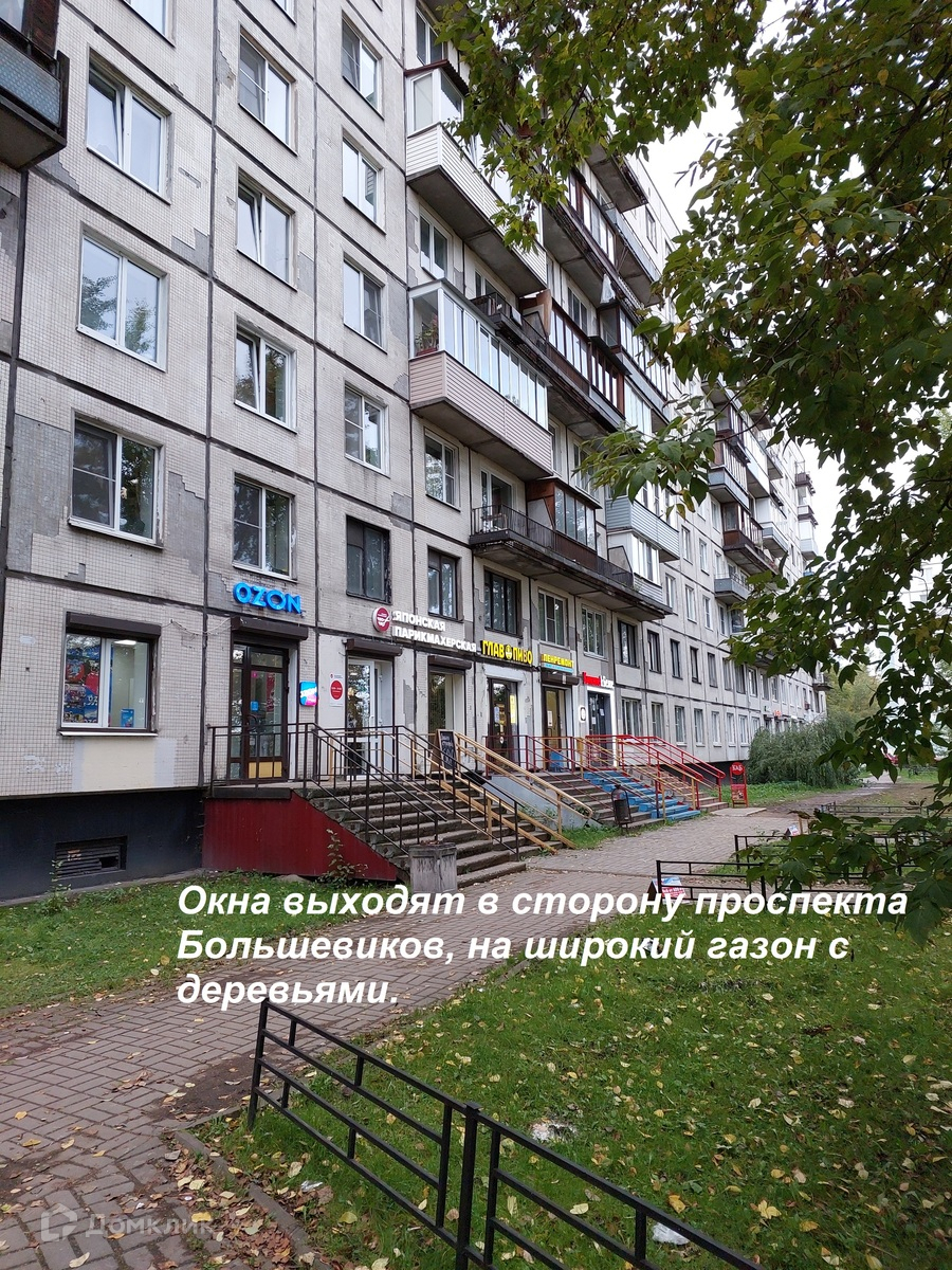 Окна выходят в сторону проспекта Большевиков, но между домом и проспектом широкий зеленй газон с деревьями.