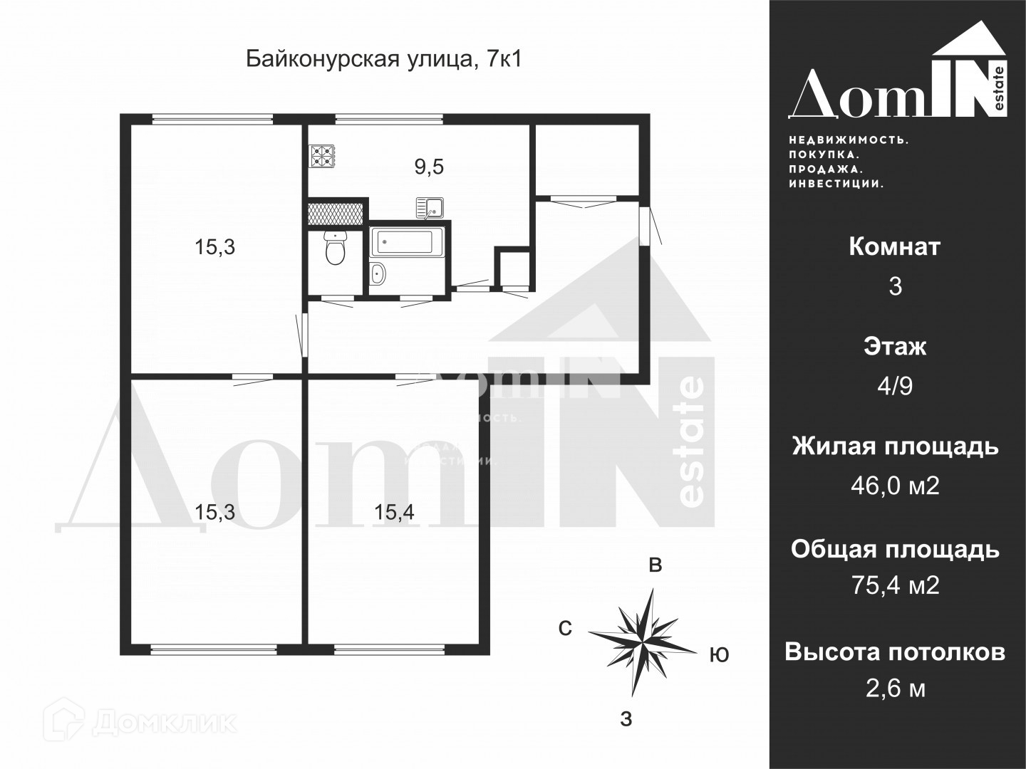 3-комнатная квартира, 75.4 м2, этаж 4 / 9, на продажу в Санкт-Петербурге, Байконурская улица, 7к1