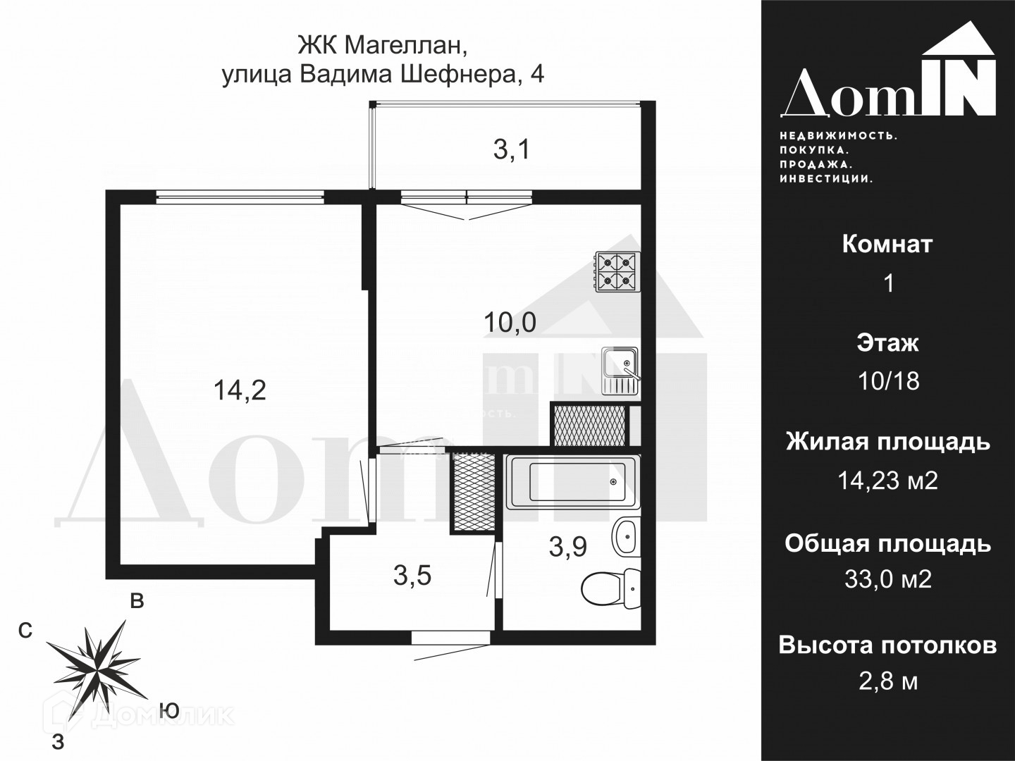 2-комнатная квартира, 33 м2, этаж 10 / 18, на продажу в Санкт-Петербурге, улица Вадима Шефнера, 4
