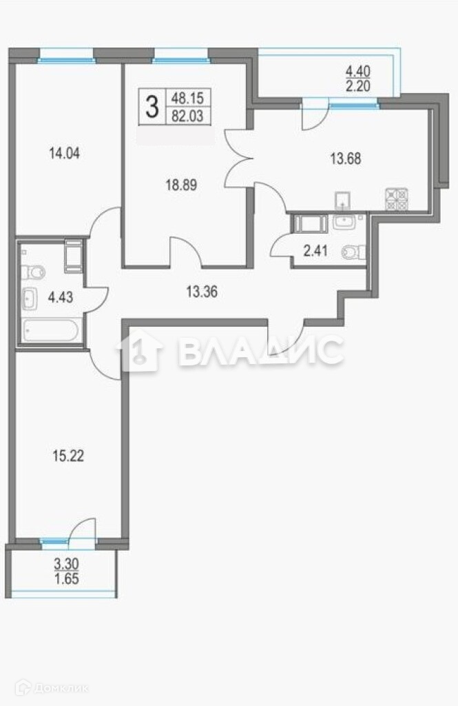 Квартира общая площадь 82,45 м2, площадь жилых комнат 14,04 и 15,22 (одна из них с лоджией), площадь гостиной 18,83 и кухня с лоджией 13,68 м2.