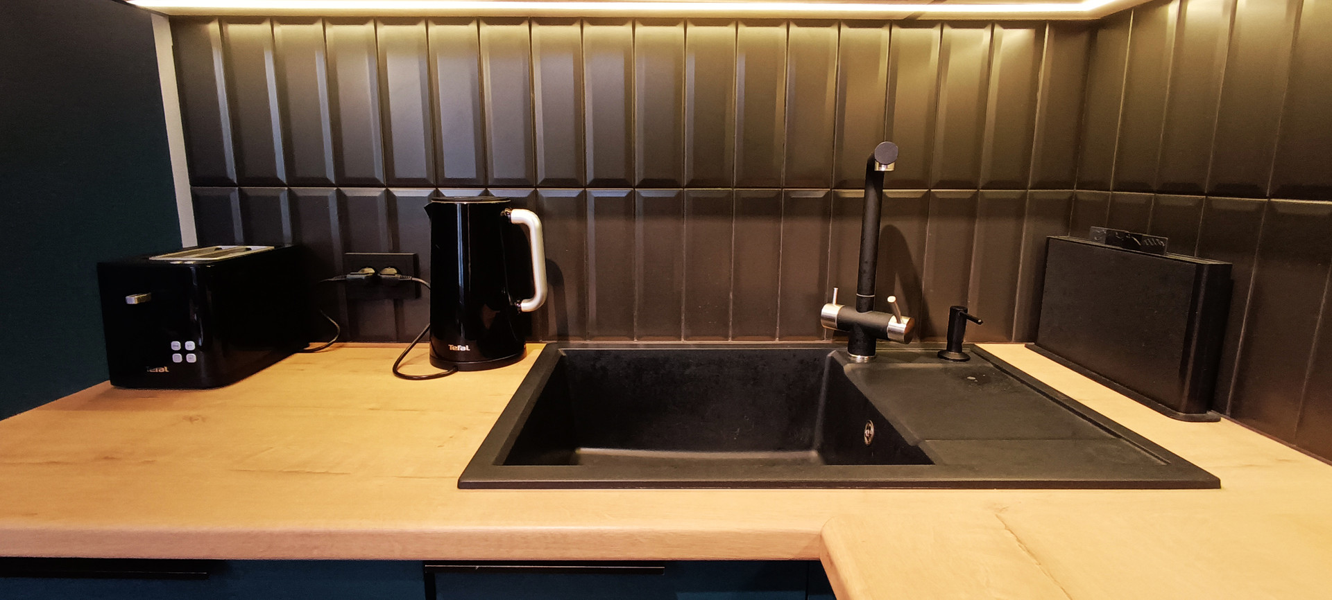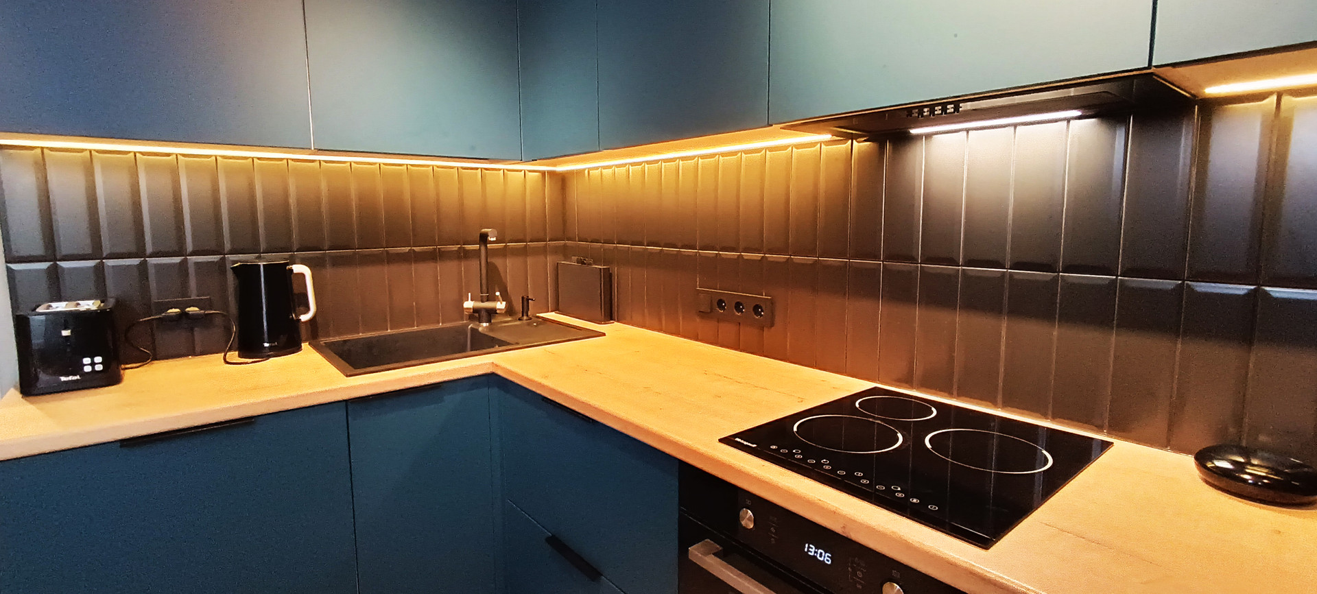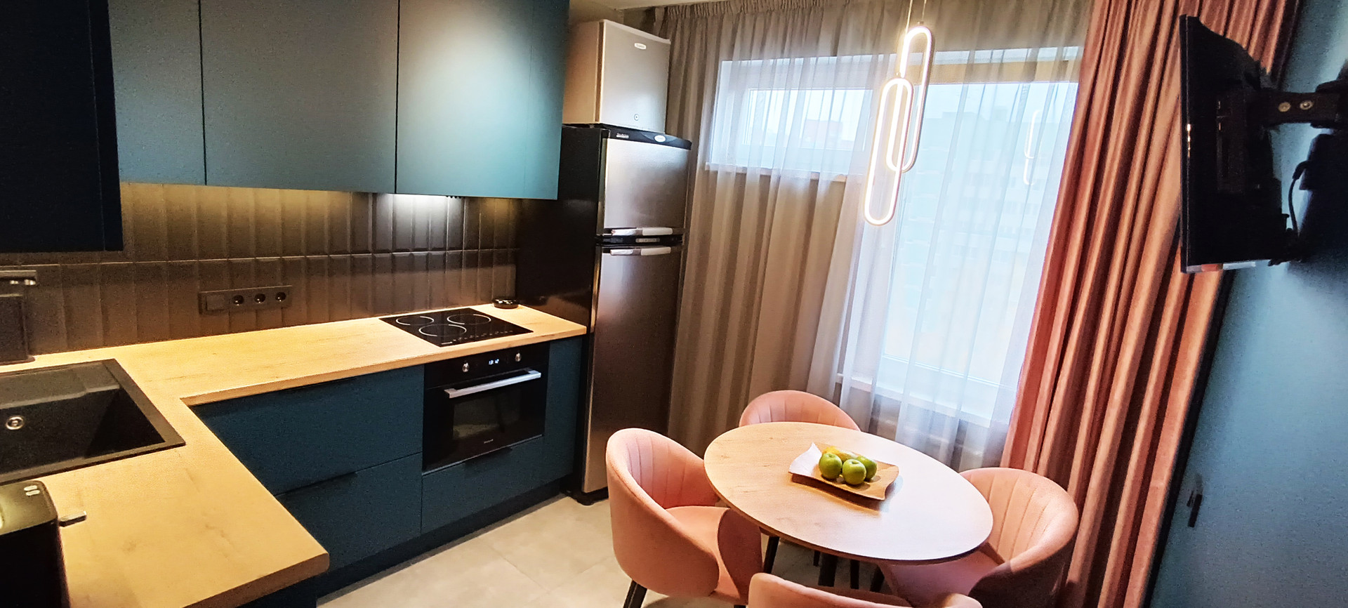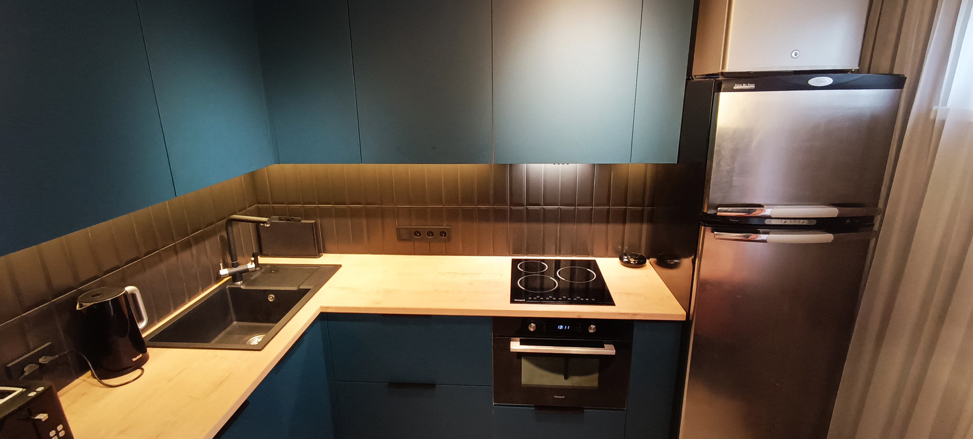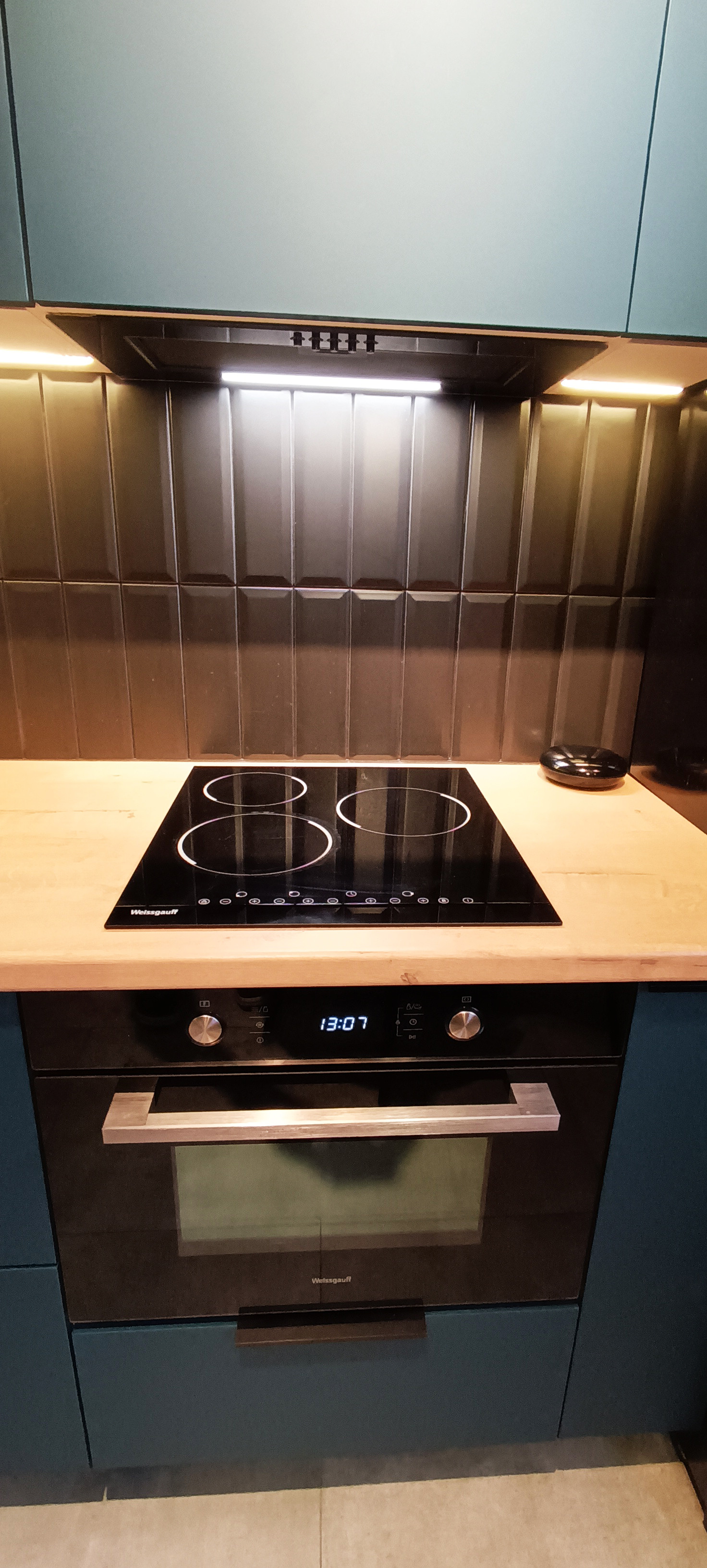 - кухня очень красивого изумрудного цвета (8,3 кв.м) оборудована кухонным гарнитуром со всей необходимой бытовой техникой (варочная панель Wеissgаuff, духовой шкаф Wеissgаuff, большая посудомоечная машина Воsсh, вытяжка Wеissgаuff) - кухонный гарнитур и вся техника остаются новым жильцам;