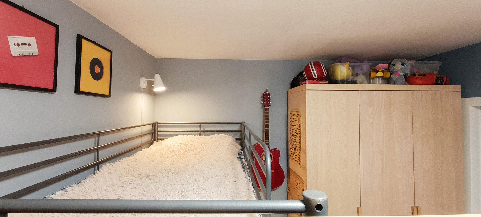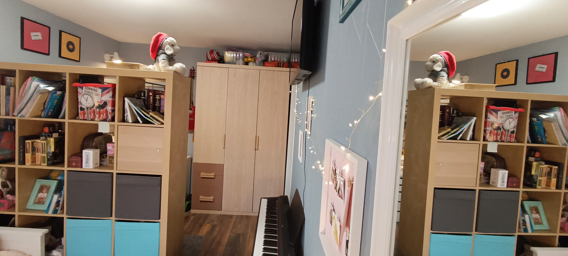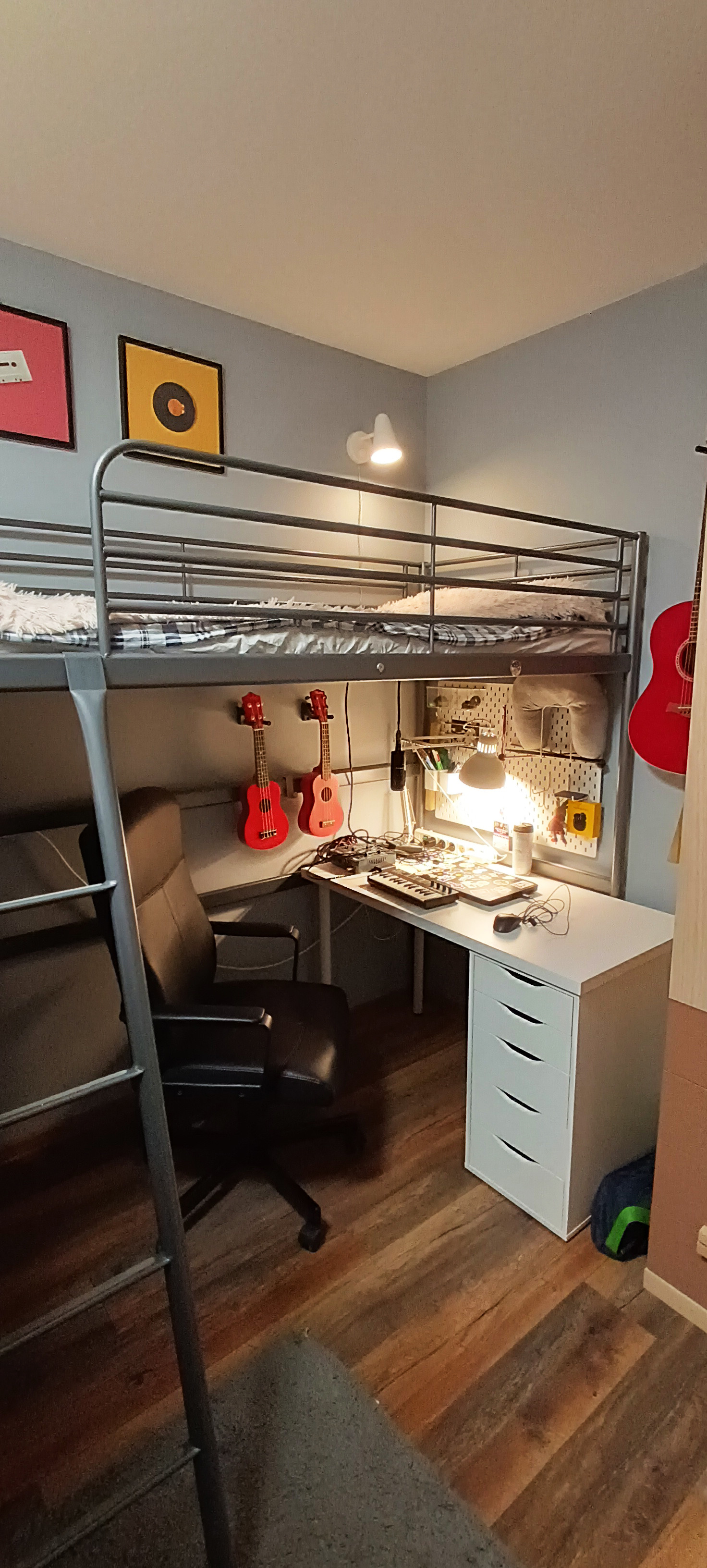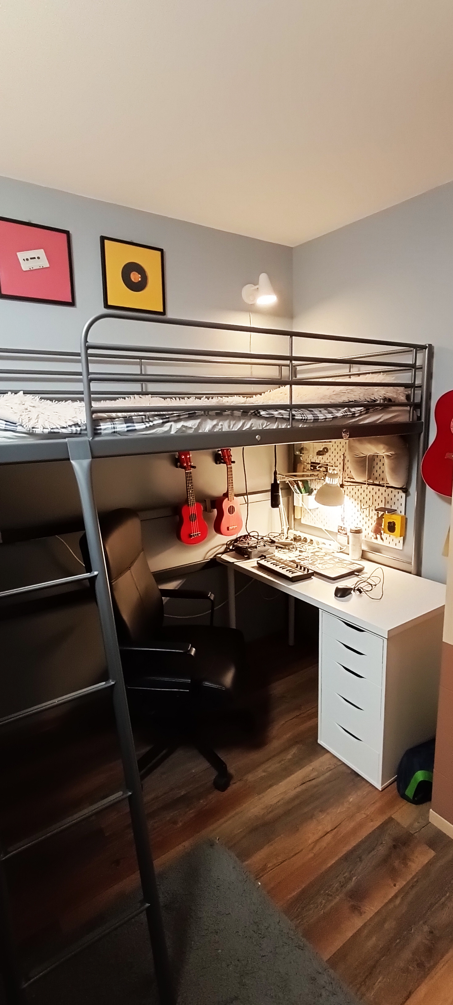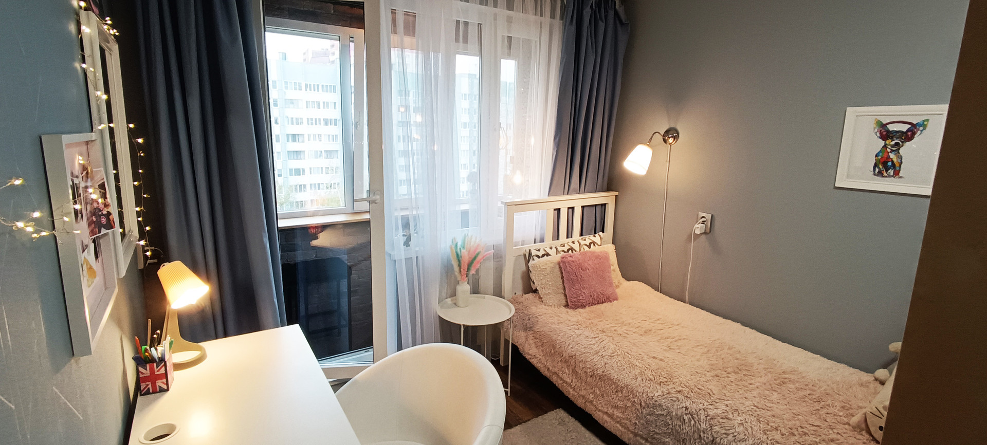 - детская (13,5 кв.м) поделена на две звоны: девичья в светлых тонах, и более брутальная мужская половина. В комнате прекрасно поместились две кровати и два рабочих места. Также есть платяной шкаф, и даже место под синтезатор нашлось)