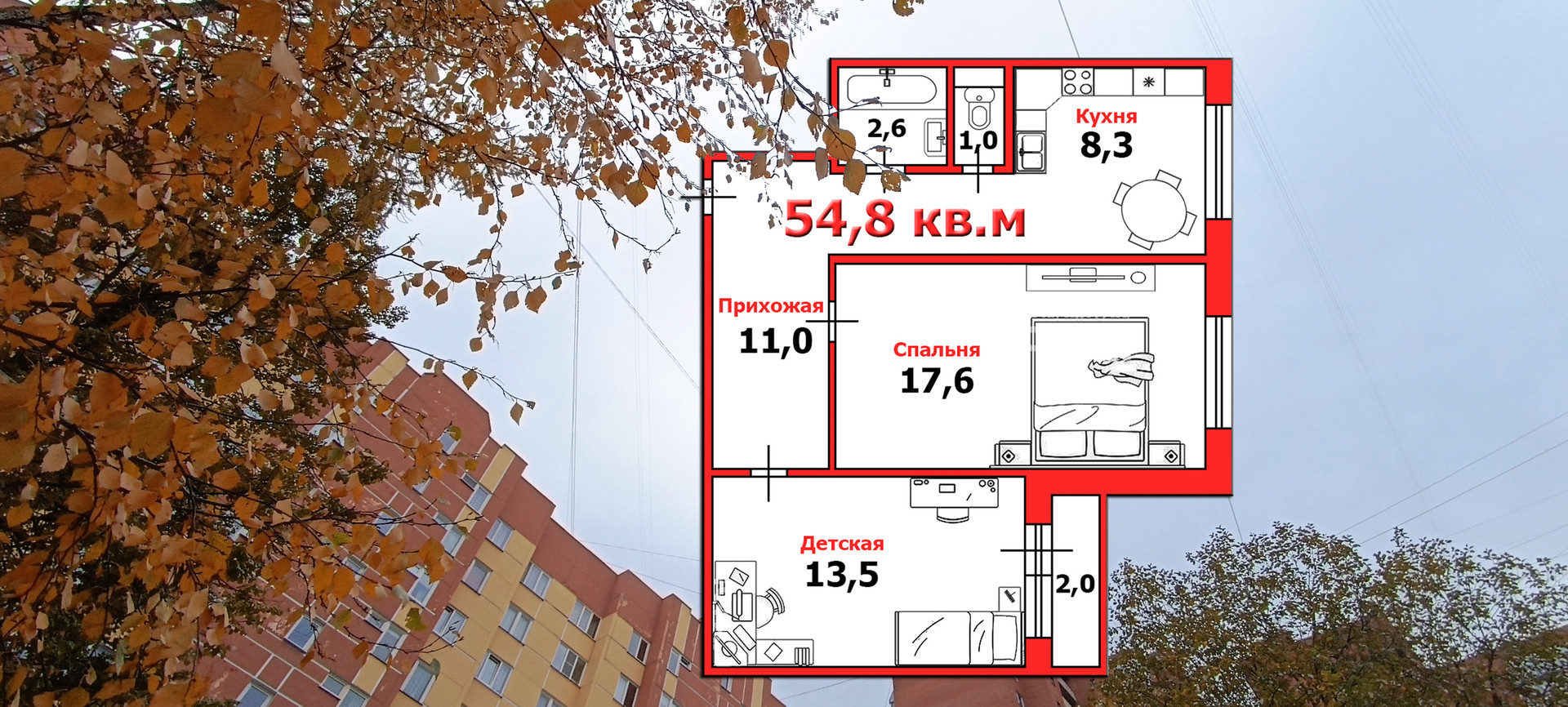 - две автономные комнаты (17,6+13,5 кв.м);