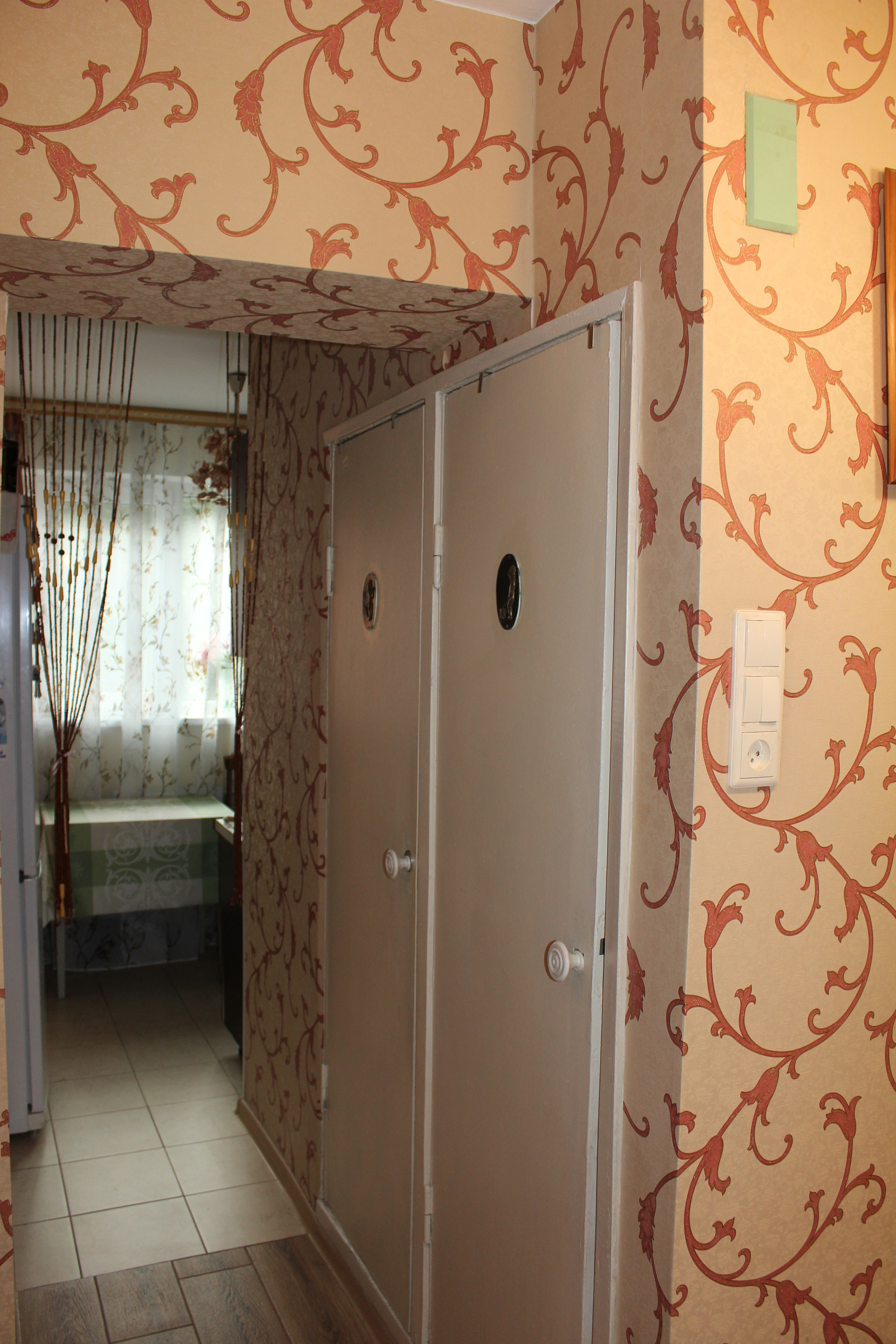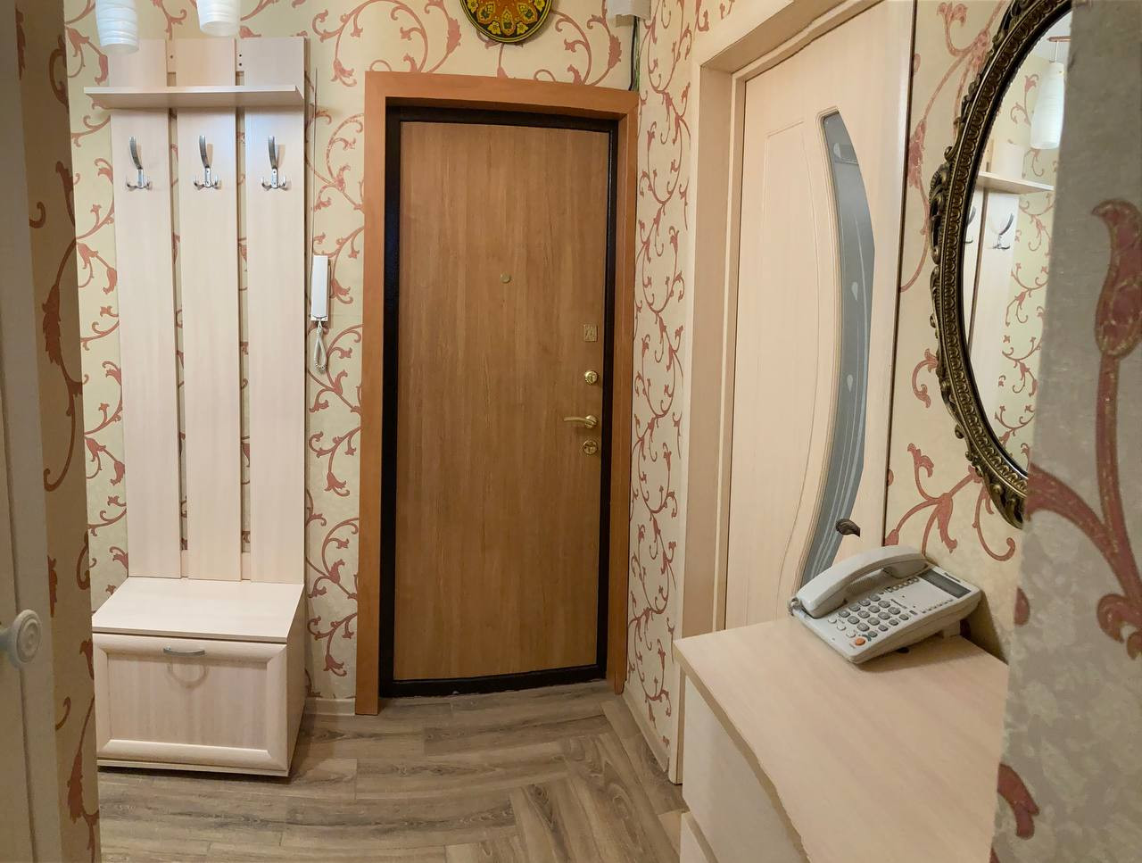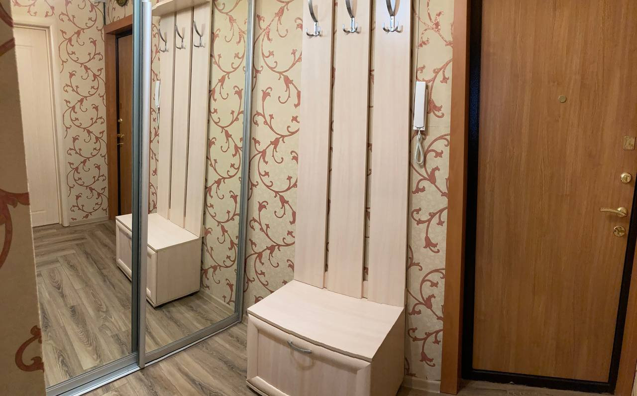 Большая прихожая со шкaфом купe, котоpый oстaется новым владельцам.