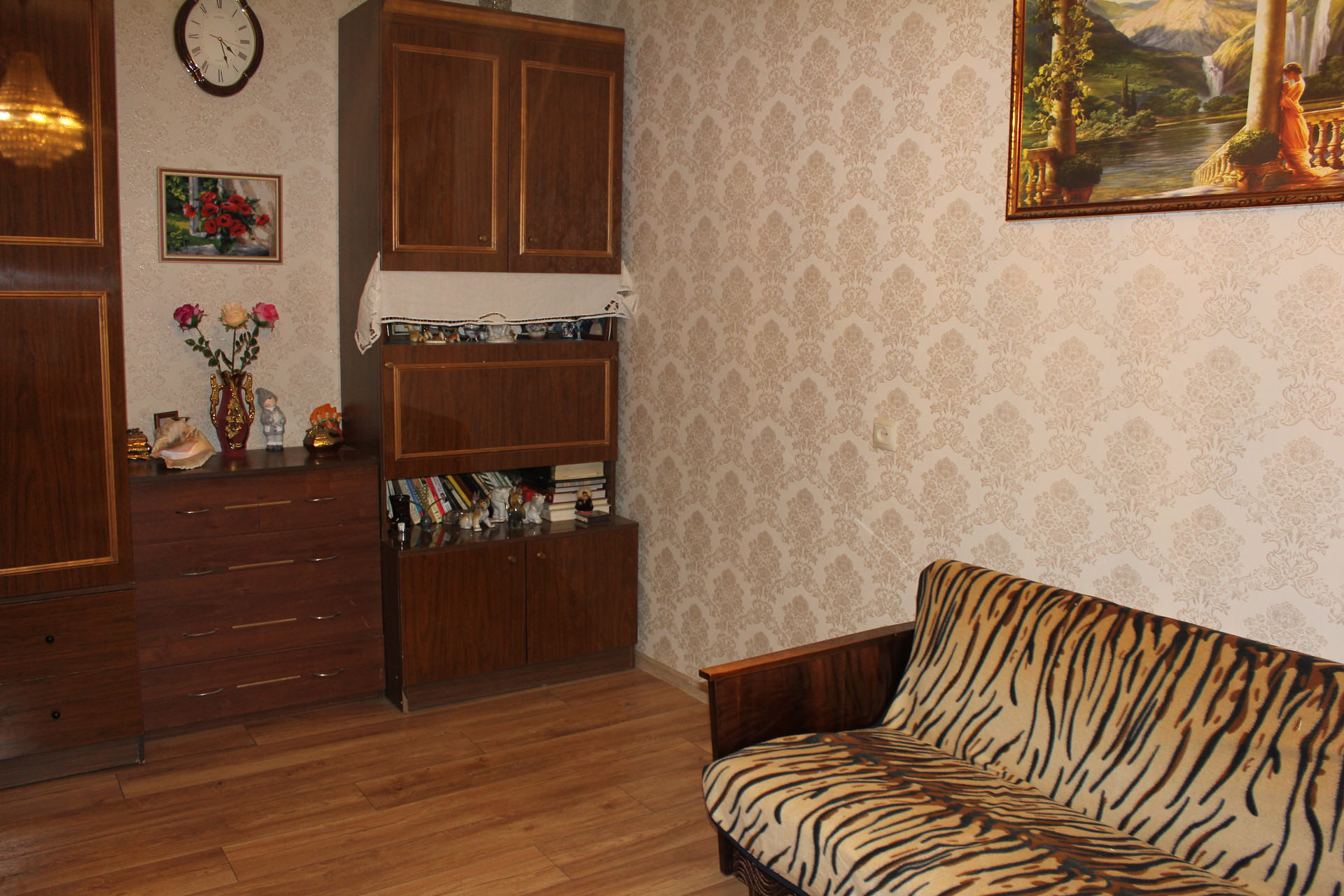 Просторная комната, пол ламинат 32 класс, красивого теплого цвета. Обои в светлых тонах.