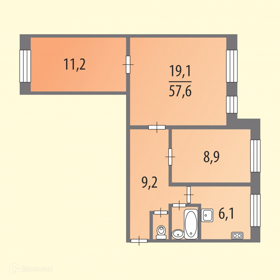 Общий метраж квартиры 57,6 м2, комнаты смежно-изолированные (19,1 + 11,2) + 8,9 м2, кухня 6,1 м2, прихожая 9,2 м2.