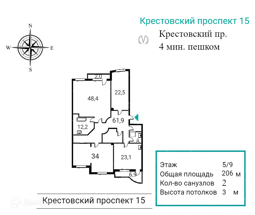 3-комнатная квартира, 207 м2, этаж 5 / 9, на продажу в Санкт-Петербурге, Крестовский проспект, 15