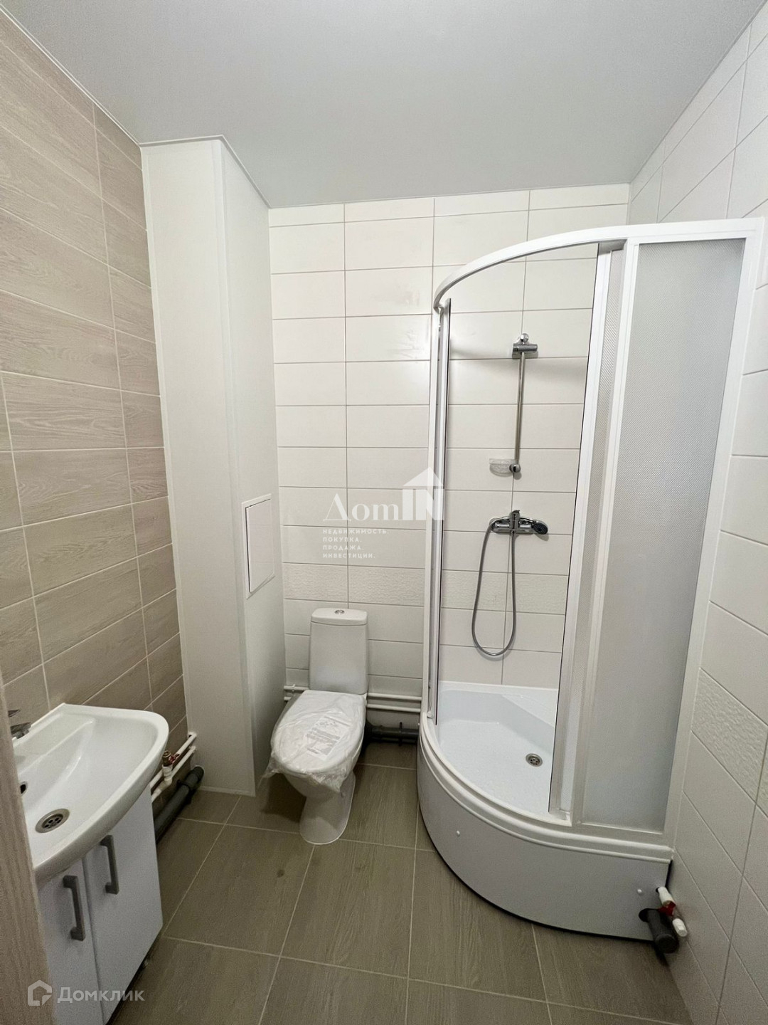 ванная комната оборудована сантехникой, душевой кабиной, сделаны выходы под стиральную машинку, стены выложены плиткой;