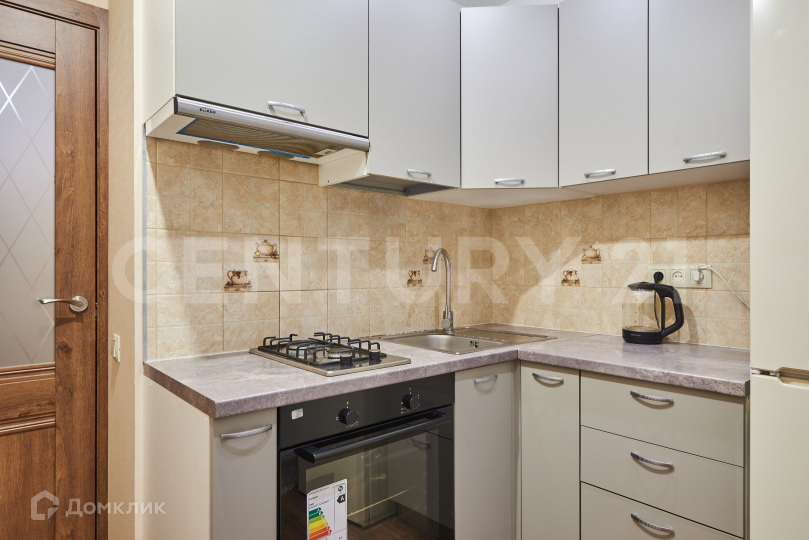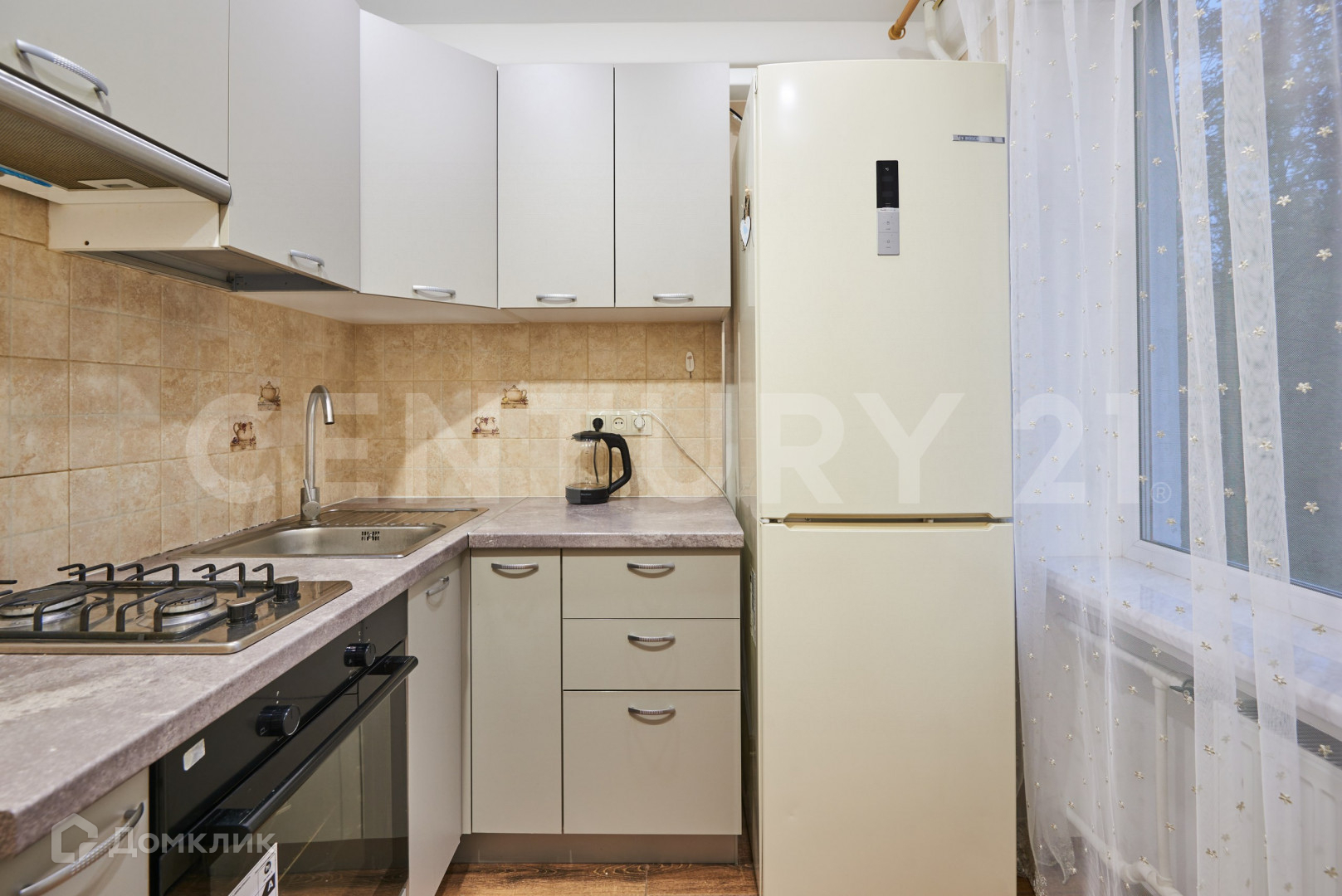 небольшая уютная оборудованная качественной техникой кухня: холодильник Bosch, плита с вытяжкой, духовка, микроволновая печь, чайник и даже тостер;
