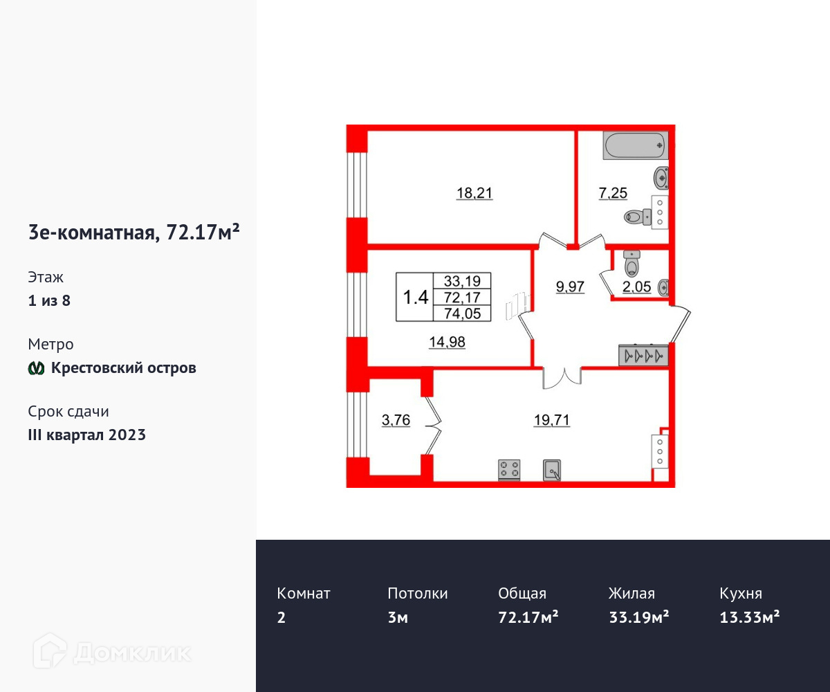 Удобная, классическая, функциональная европланировка, большая кухня-гостиная 13.33 м², просторная прихожая 9.97 м². Общая площадь квартиры - 72.4 м², жилая – 33.19 м², высота потолка 3 м.