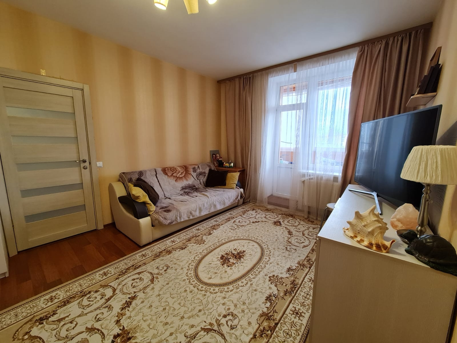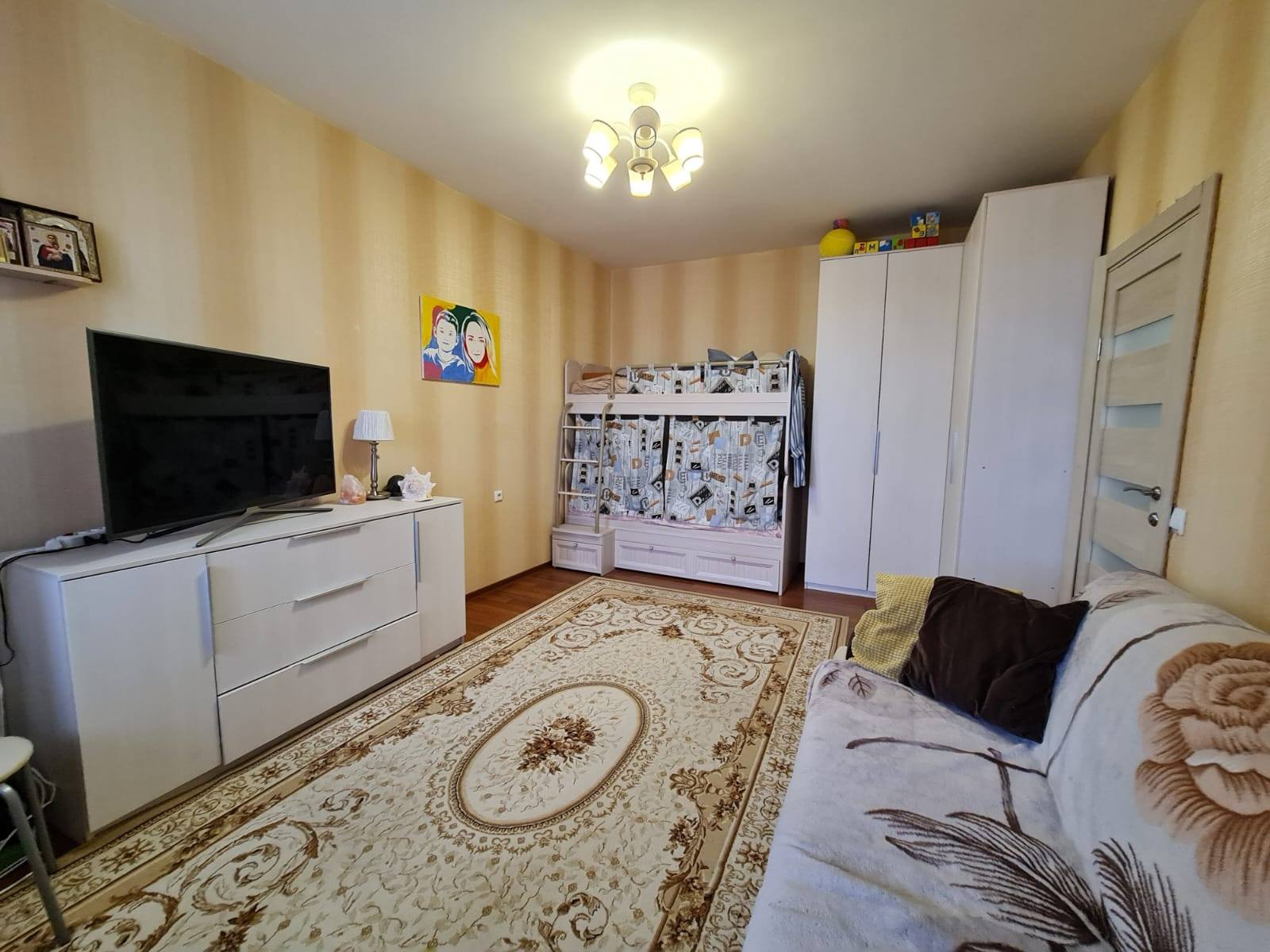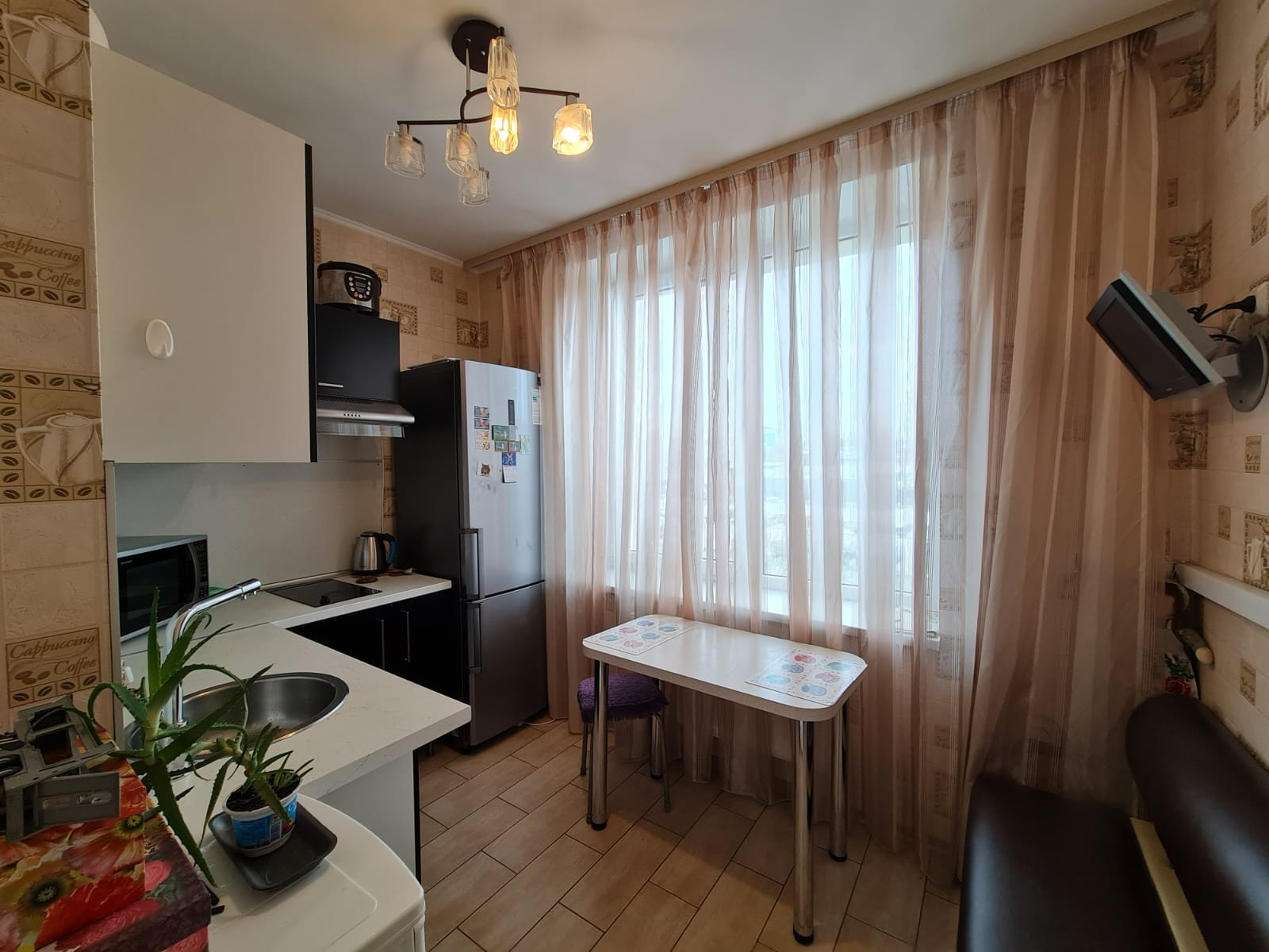 Уютная квартира 34 кв.м с ремонтом. Вся мебель остается новым владельцам! Светлая вместительная кухня оснащена всем необходимым.  Холодильник,  варочная панель, духовой шкаф, микроволновая печь, телевизор. В коридоре установлен кондиционер. Раздельный санузел. В ванной комнате стиральная машина и полотенцесушитель, подключенный к центральной системе. В спальне большой диван, вместительный шкаф и детский уголок. Из спальни выход на остекленный балкон. Заезжай и живи! Ничего делать не нужно!
