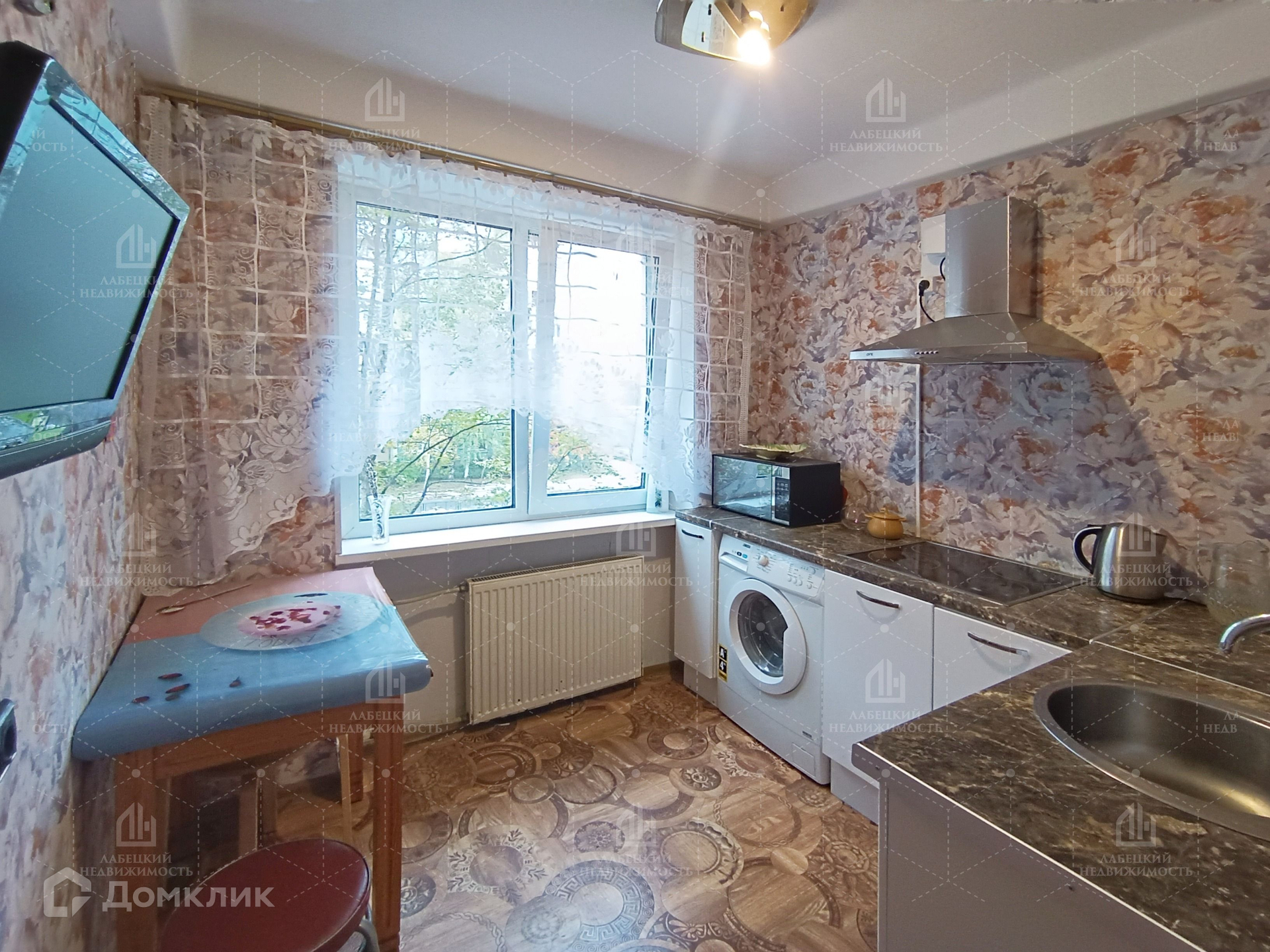 -Кухня правильной формы (6.1 м²) с кухонной мебелью и всей необходимой бытовой техникой.
