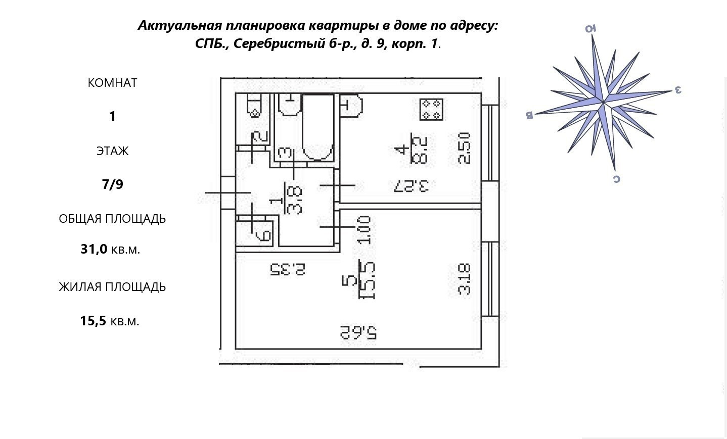• Общая площадь квартиры – 31,0 кв. м. Высота потолков 2,55 кв. м.