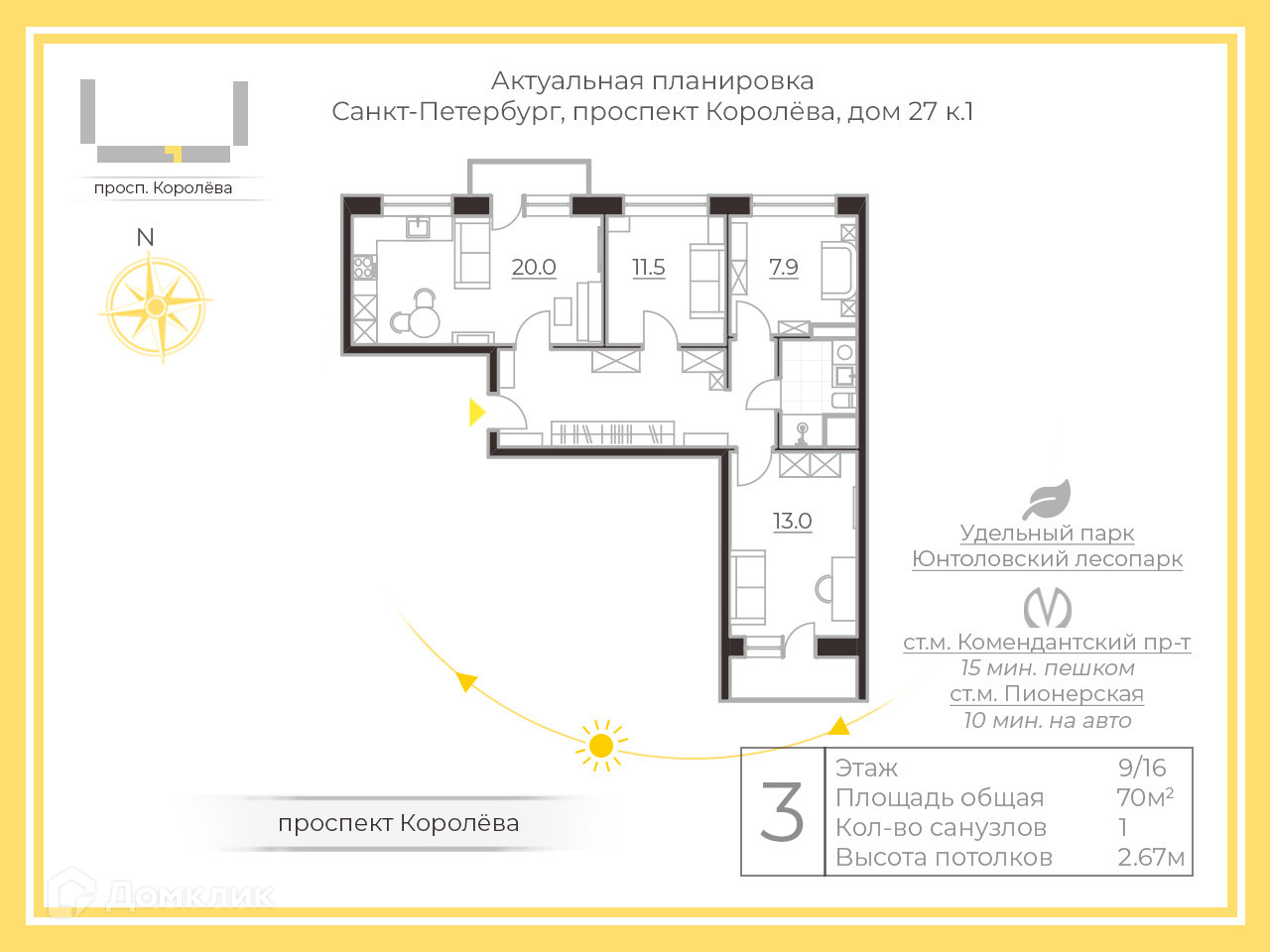 3-комнатная квартира, 70 м2, этаж 9 / 16, на продажу в Санкт-Петербурге, проспект Королёва, 27к1
