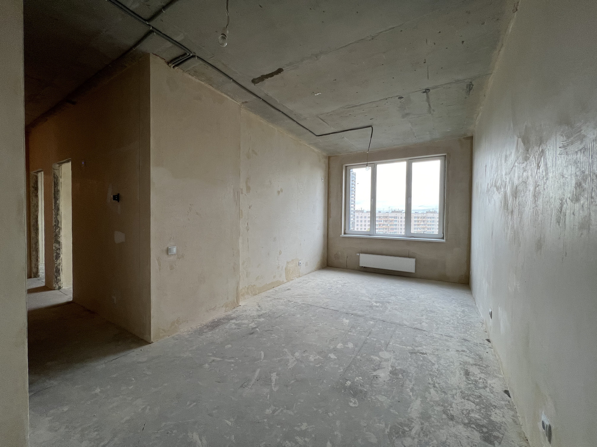 Квартира сдается с белой отделкой. Залита стяжка во всех помещениях, выполнены электротехнические работы, а также работы по водоснабжению, канализации и отоплению.