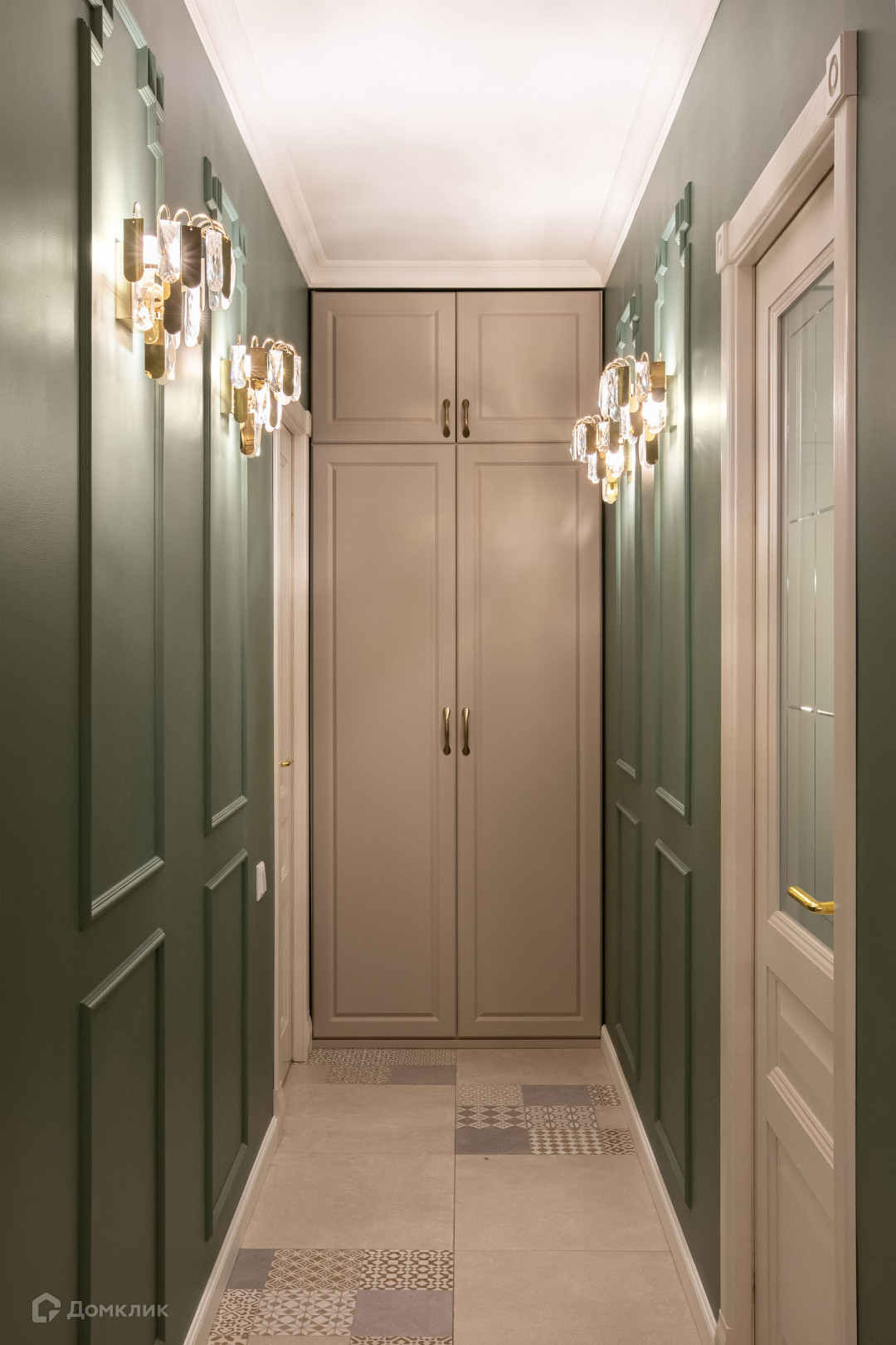 зона прихожей в коридоре со стильными шкафами для хранения;