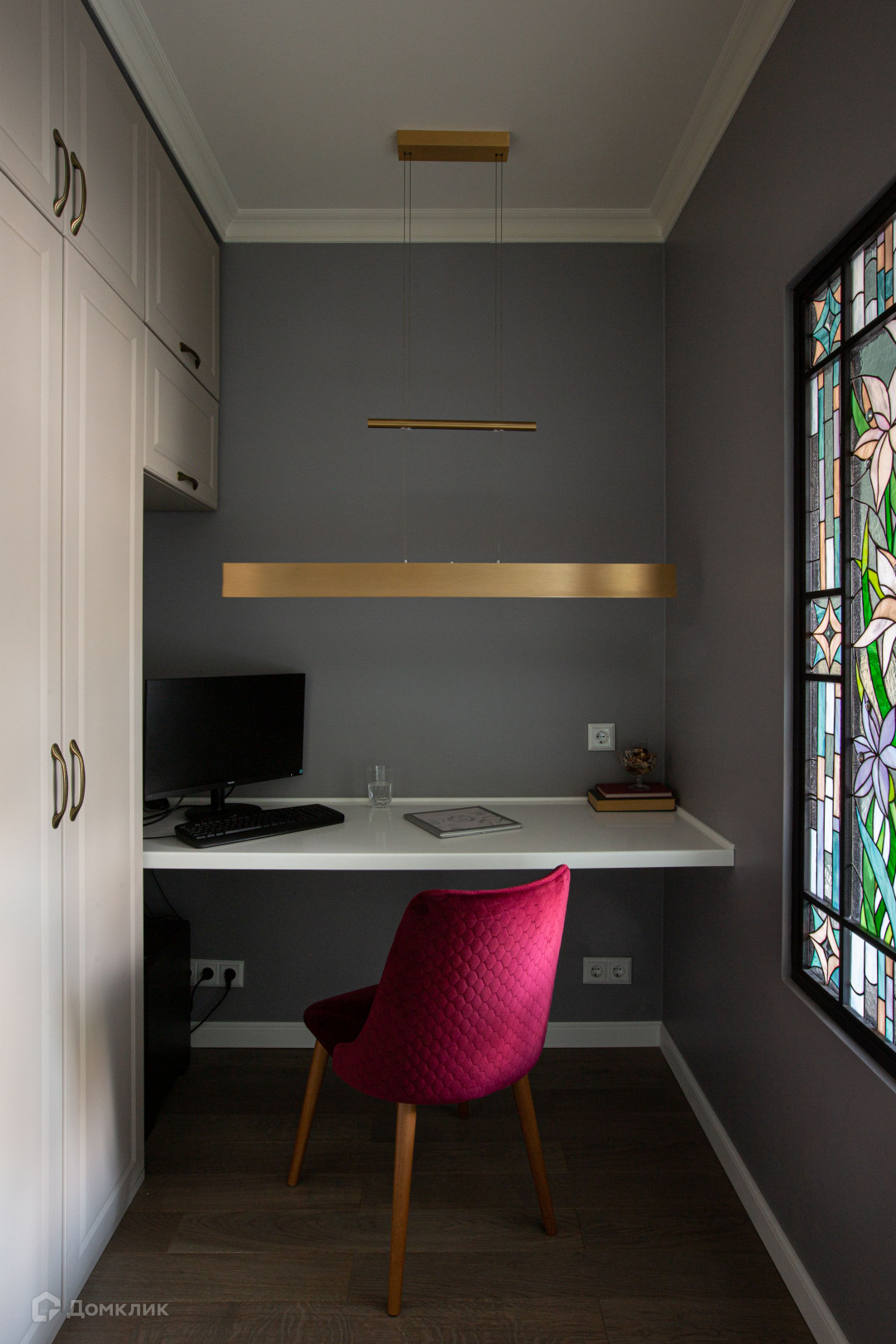 и роскошное пространство мастер-спальни, включающее в себя санузел с душем, рабочую зону с письменным столом и зону отдыха, отделенную перегородкой с витражем.