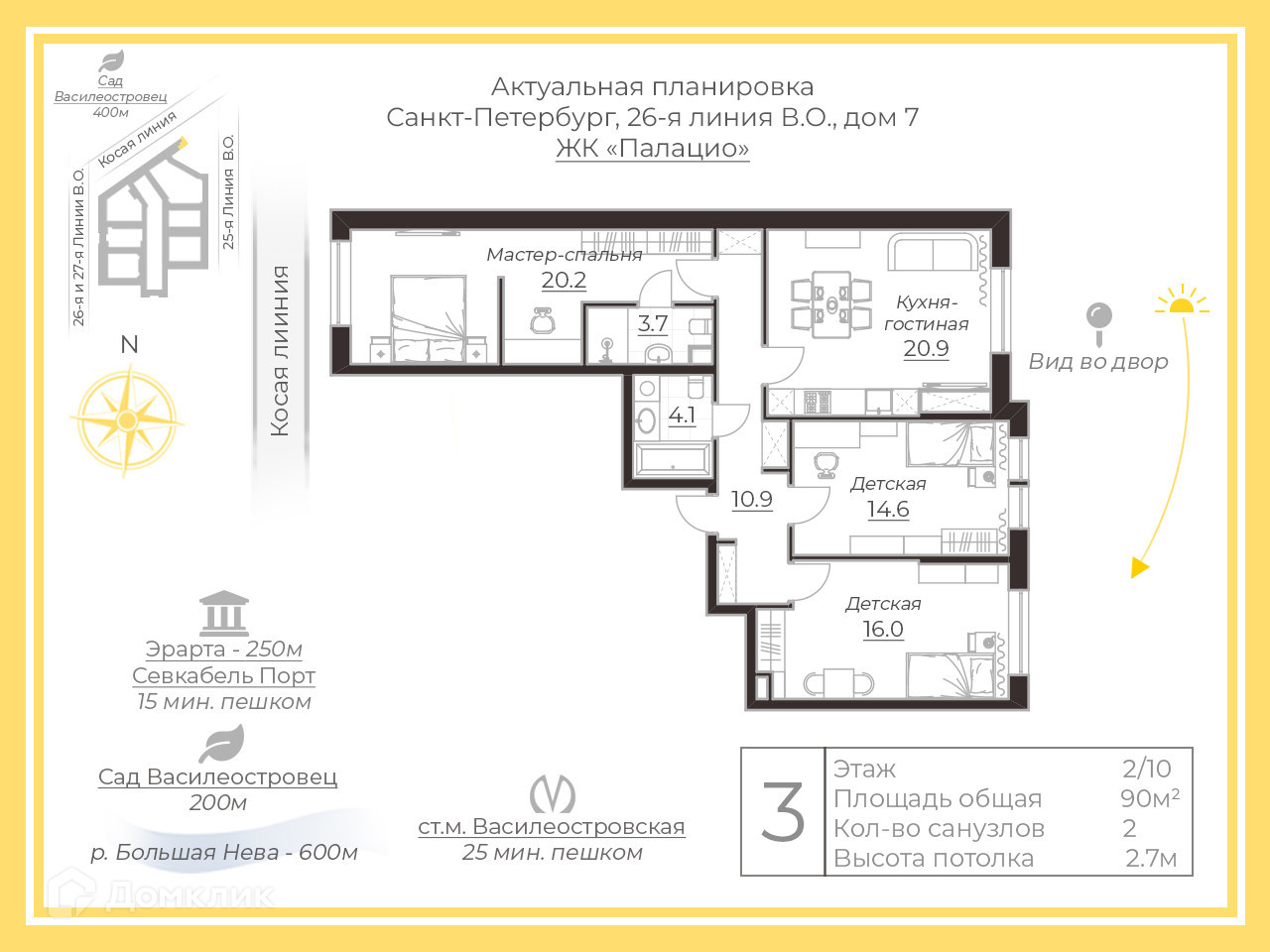 Мебель и техника остается. Окна кухни-гостиной и детских комнат выходят в тихий зеленый двор, окна мастер-спальни – на Косую линию.