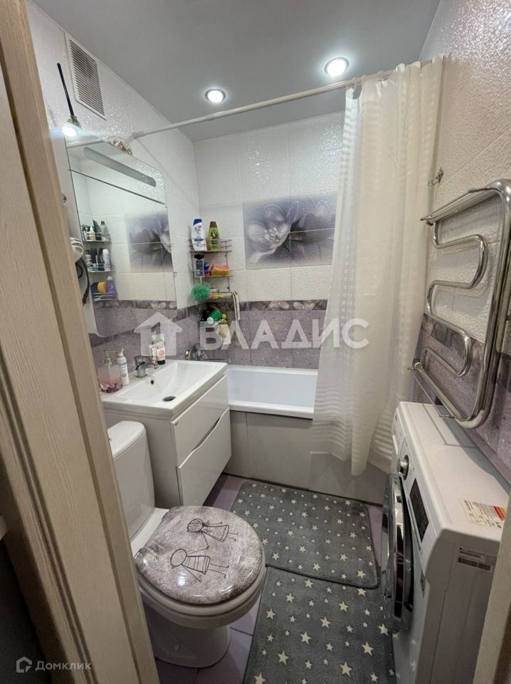 Совмещенный санузел отделан плиткой в светлых тонах до потолка с большой ванной, стиральной машиной, зеркалом и шкафом для хранения.