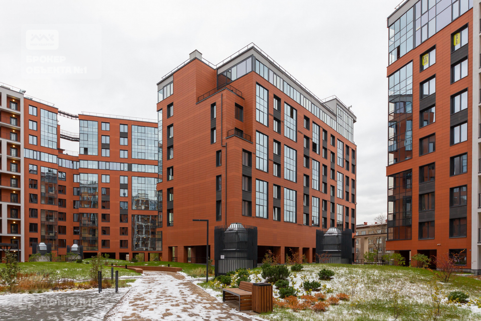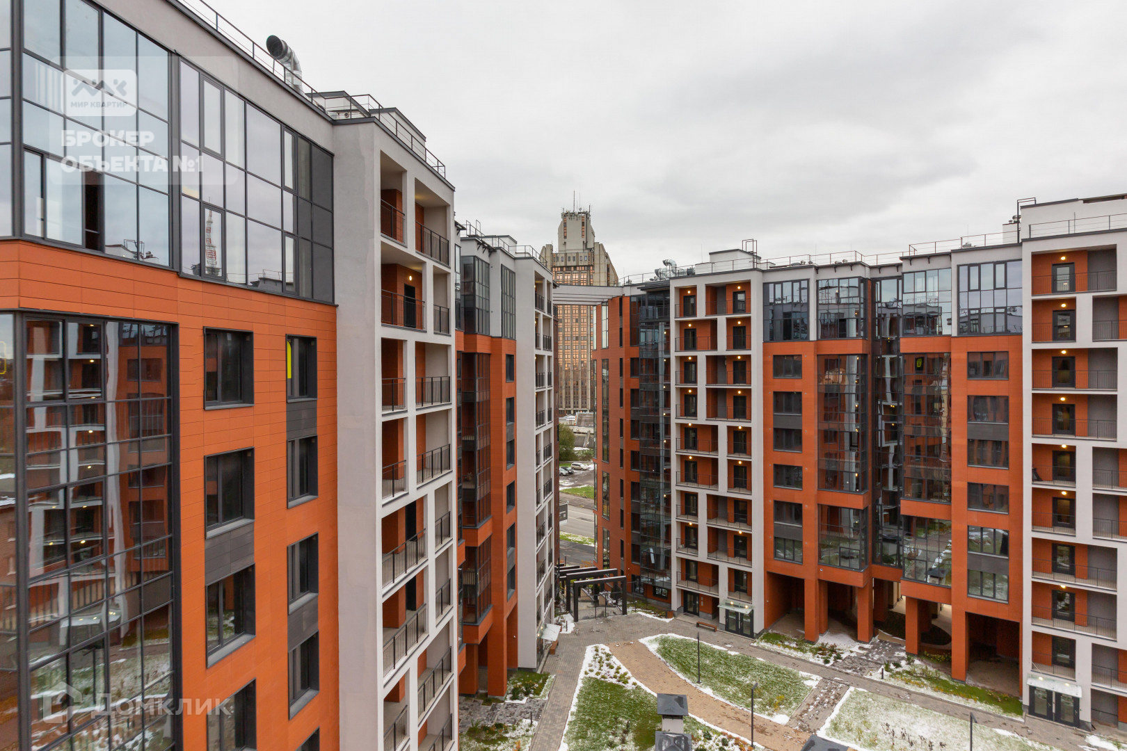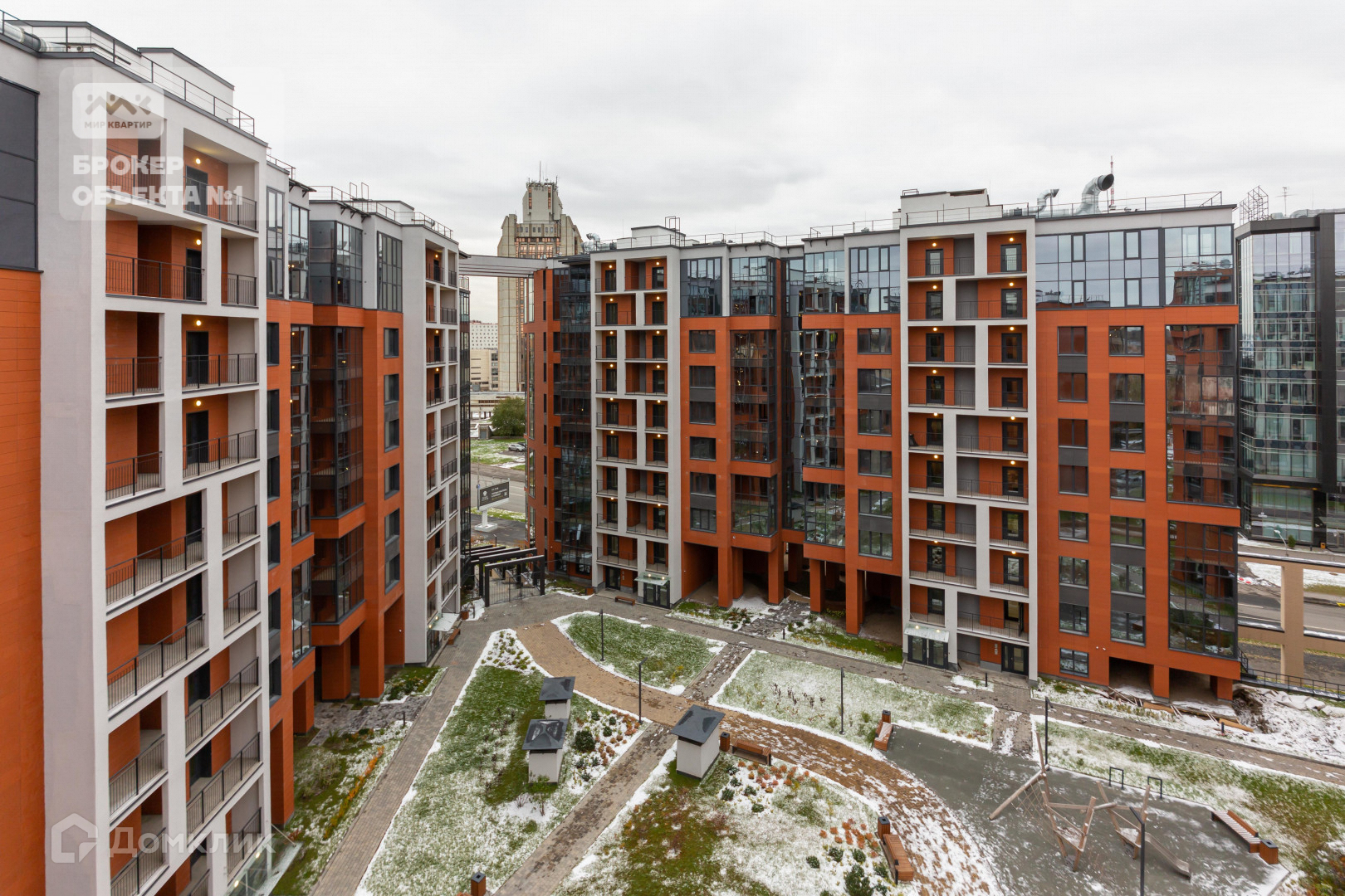 Жилая часть состоит из пяти корпусов, объединённых стилобатом.