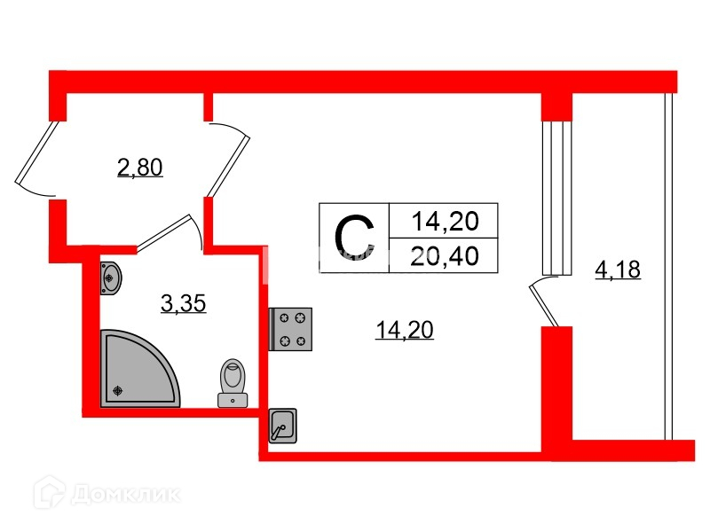 Общая площадь 20.4 м2