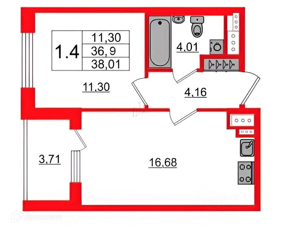 Общая площадь 37.8 м2