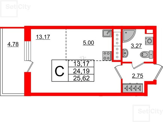 Общая площадь квартиры 24,2 кв.м.,