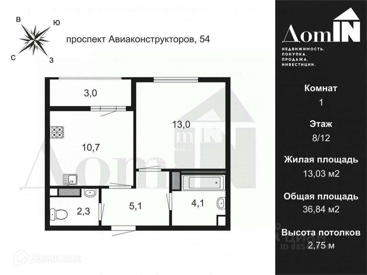 1-комнатная квартира, 37 м2, этаж 8 / 12, на продажу в Санкт-Петербурге, проспект Авиаконструкторов, 54