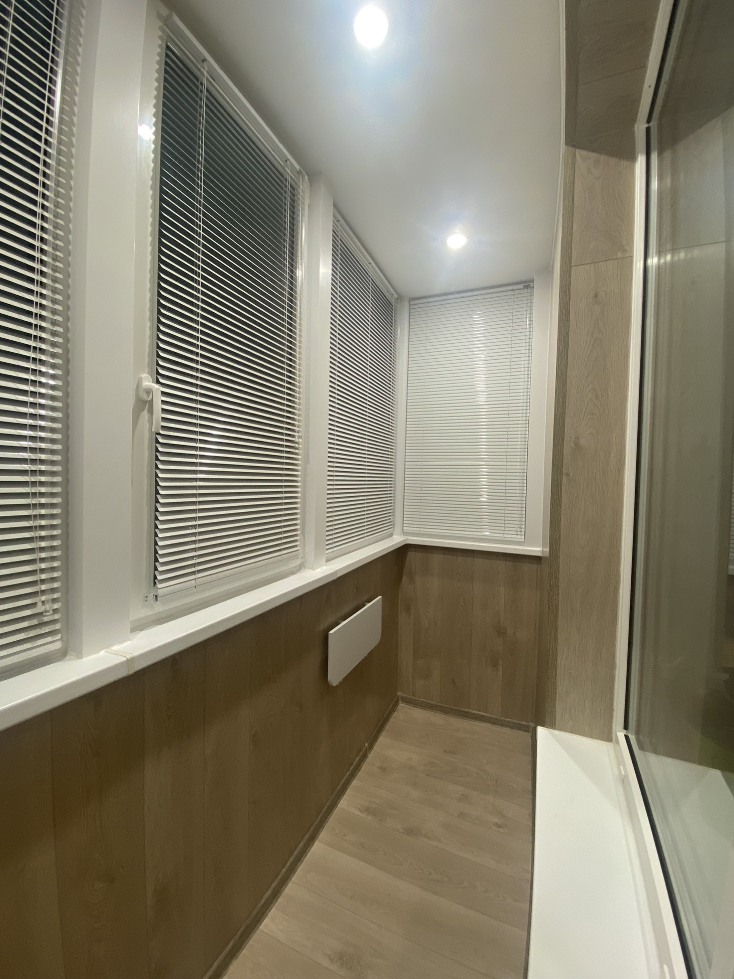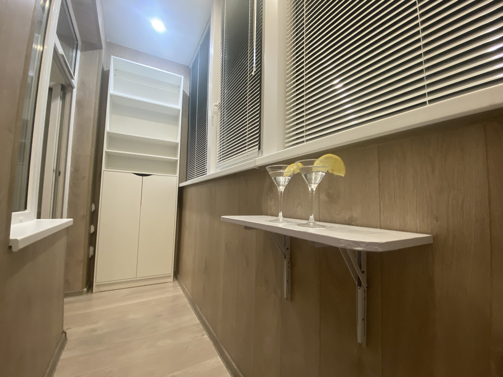 Лоджия хорошо утеплена, сделан теплый пол, вариативное освещение, есть розетка, индивидуальный проект шкафного модуля и столика.