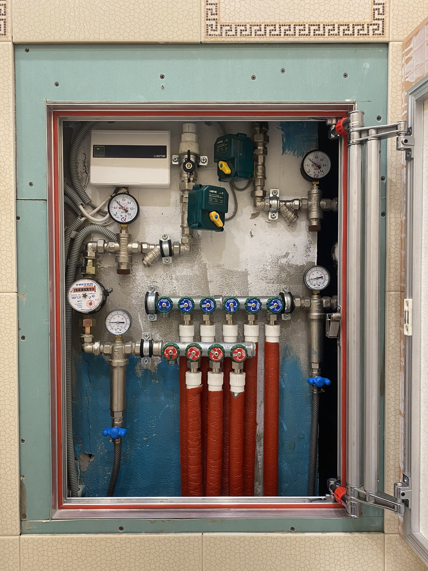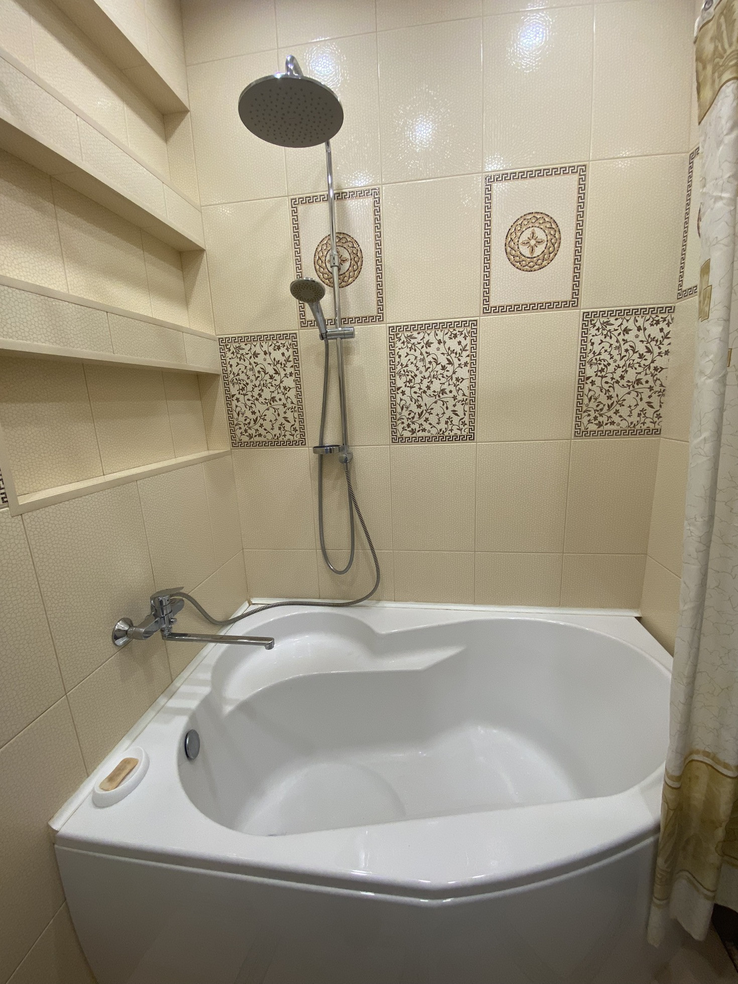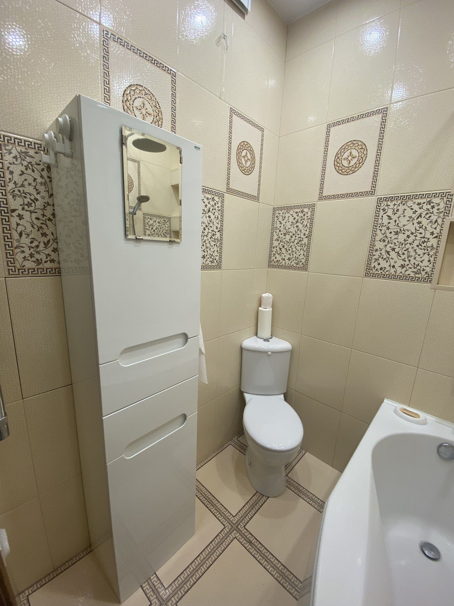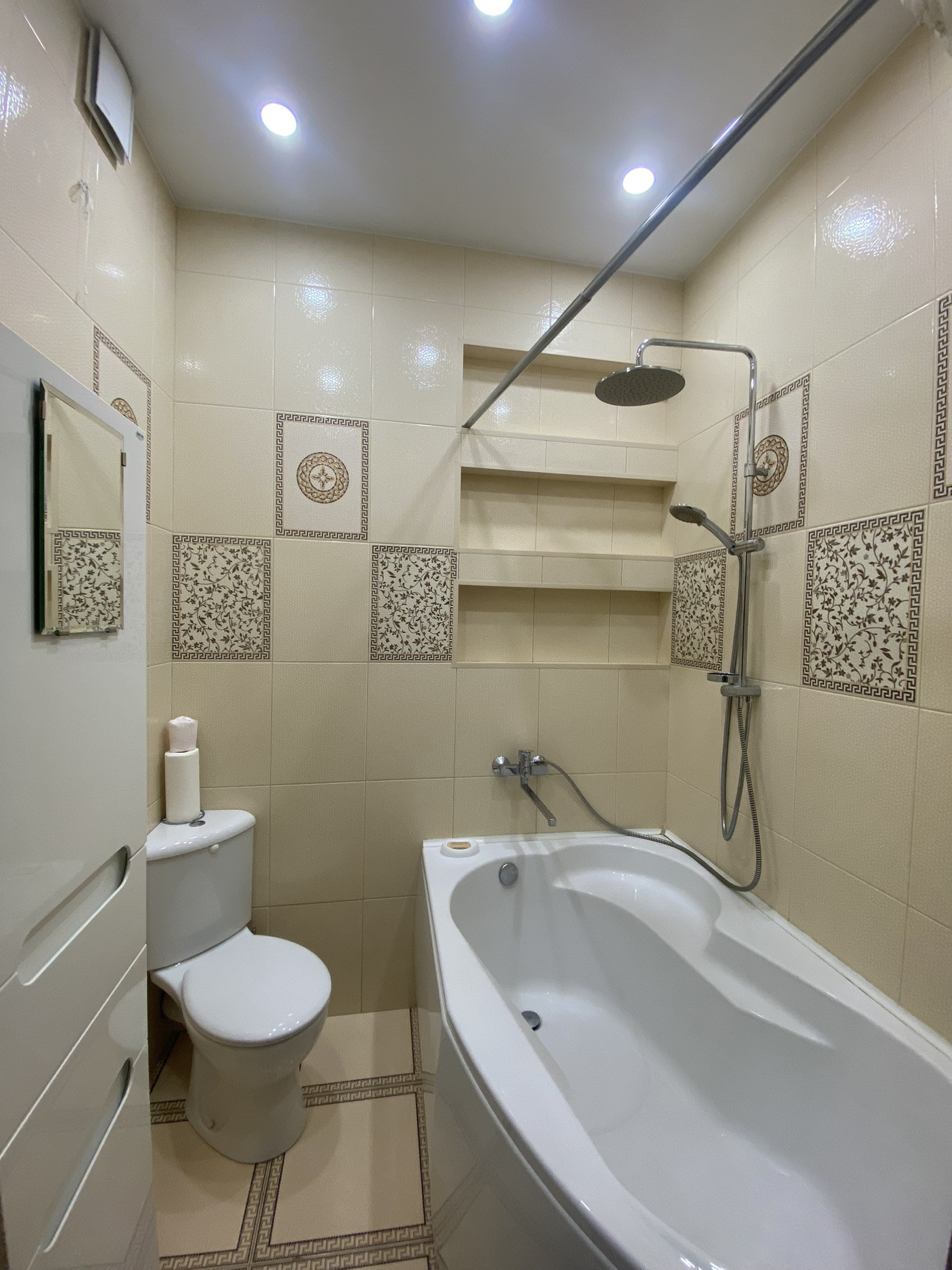 Санузел совмещенный, унитаз угловой, ванна нестандартных размеров, выполнена на заказ, очень удобная и комфортная. На полу система аквастоп. Вся разводка находится в отдельных щитах, которые не портят общий вид ванной комнаты.