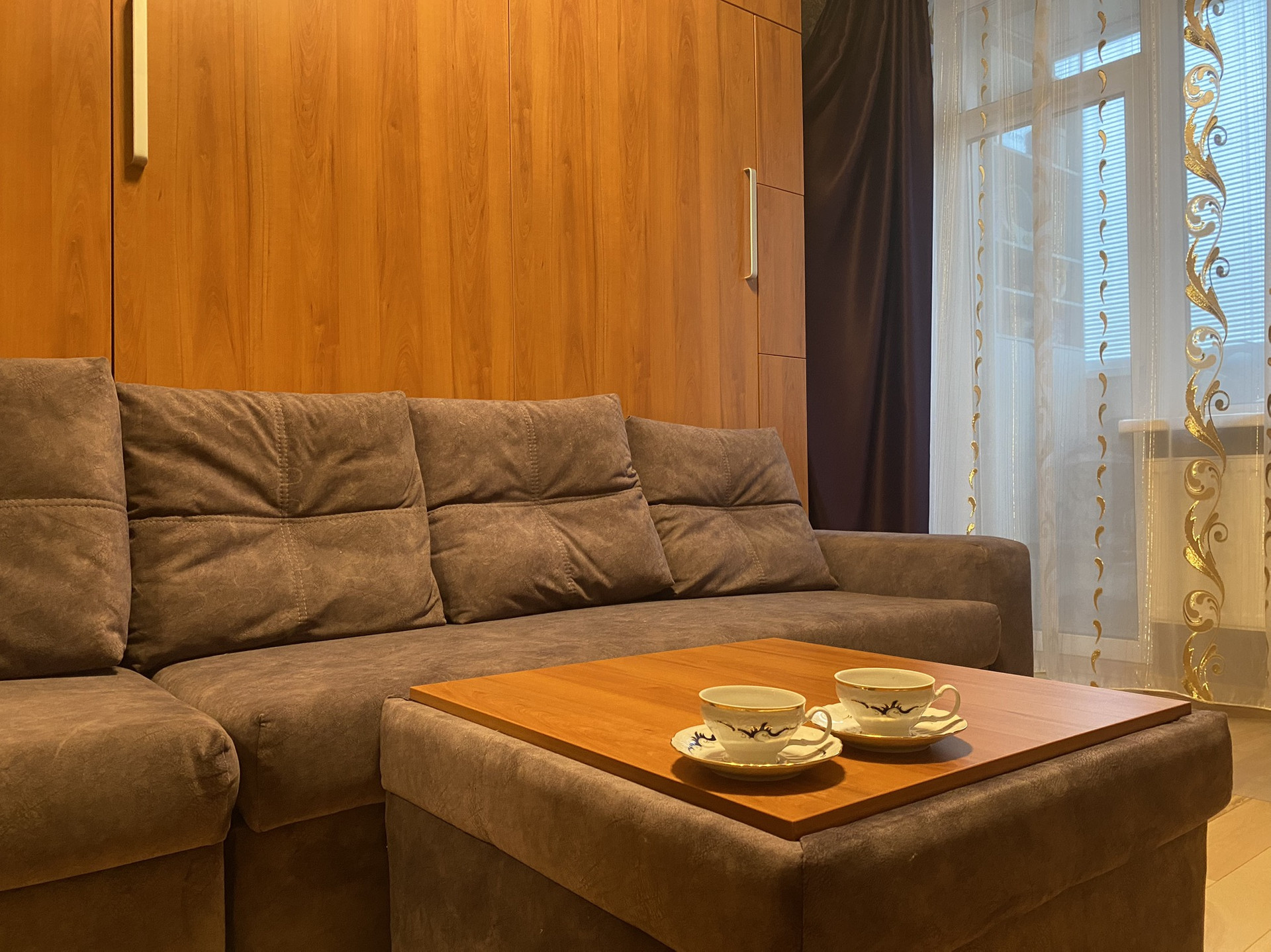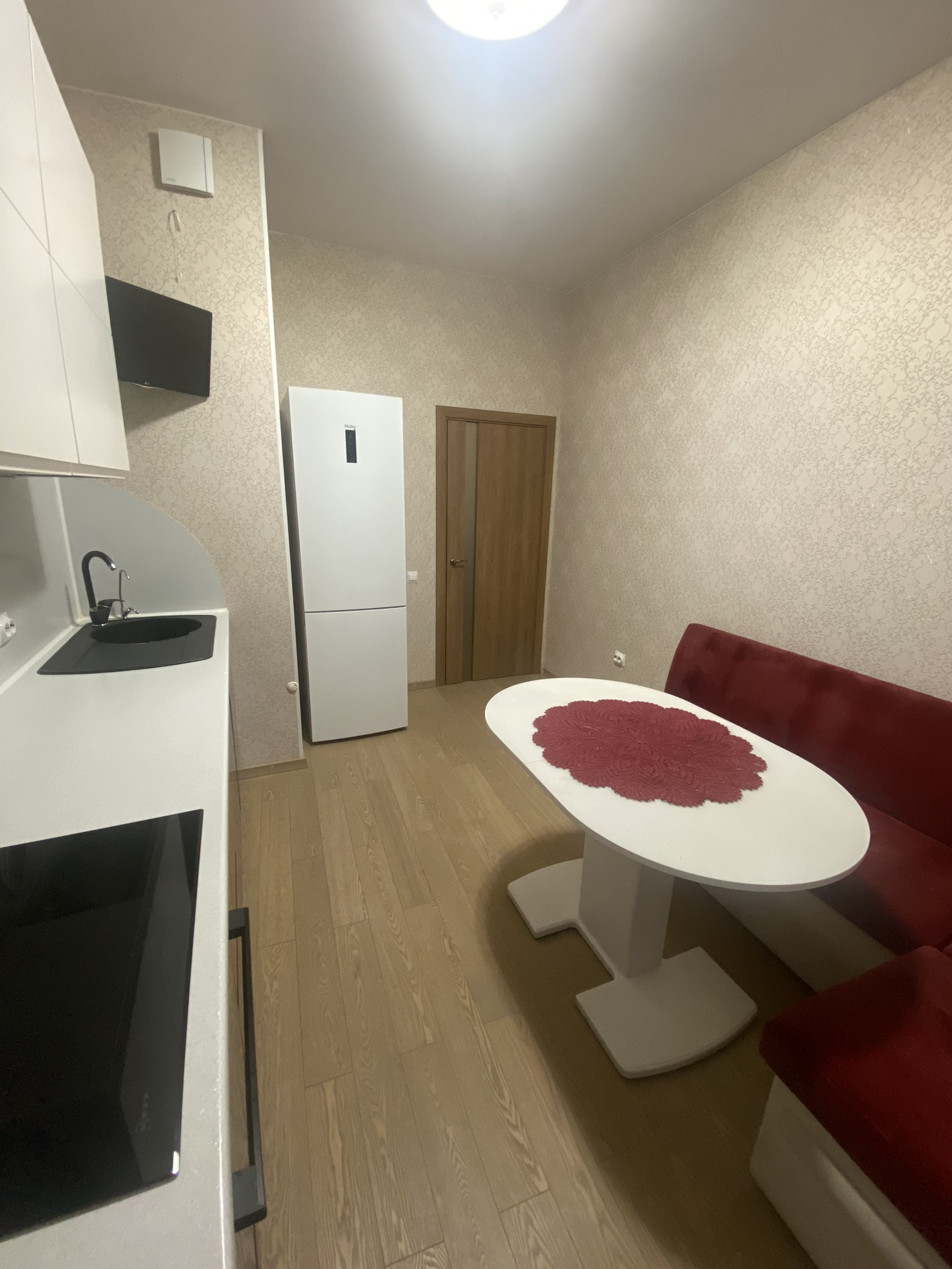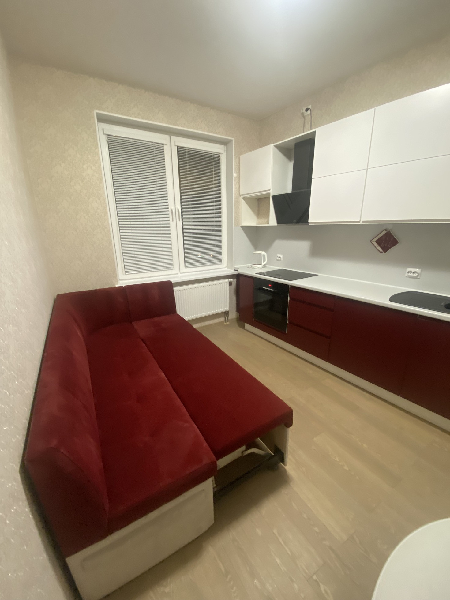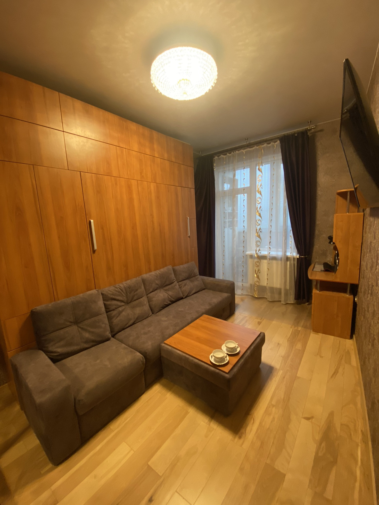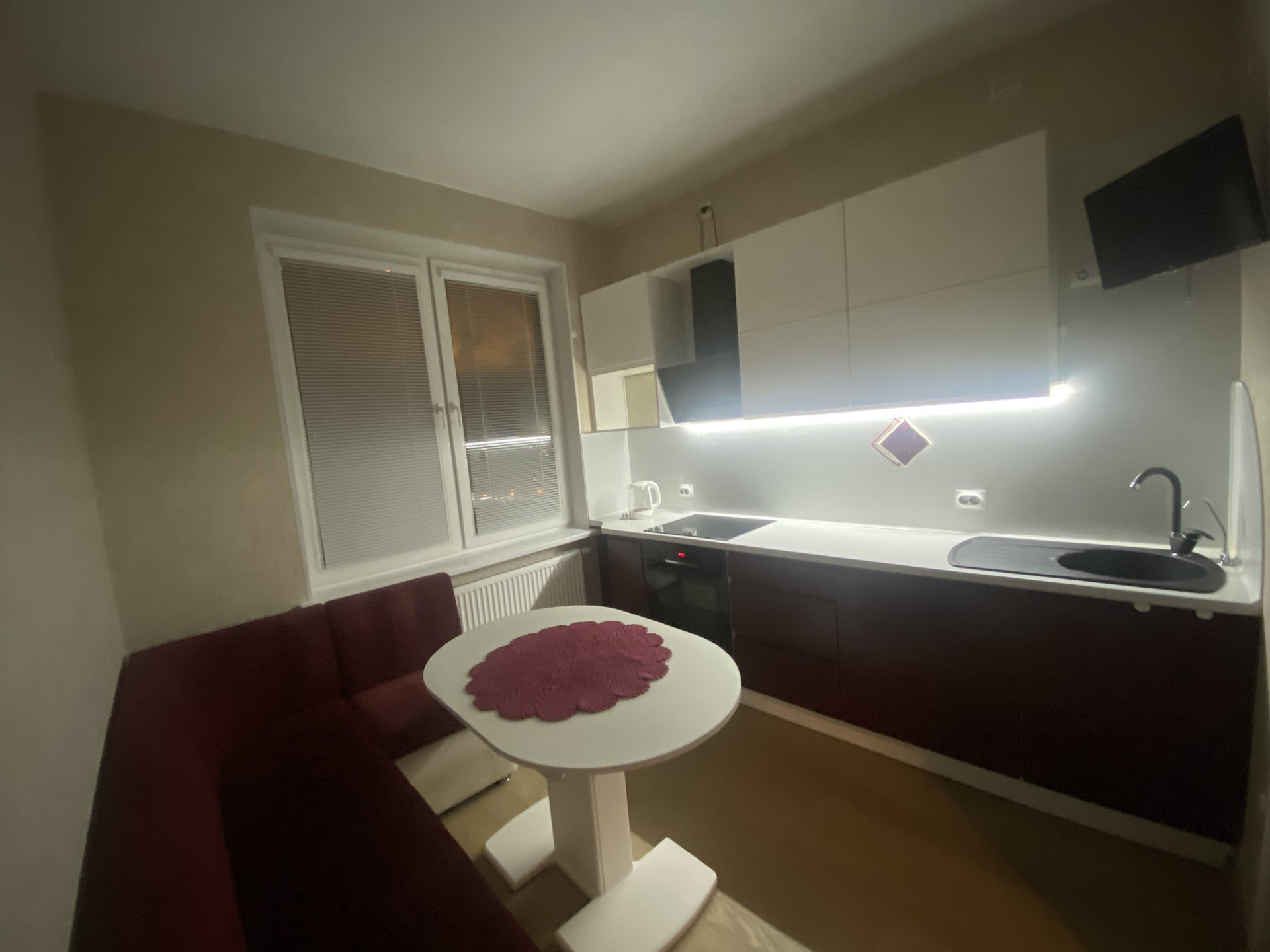 Кухня с дорогой техникой (Bosh, Neff, Elica, LG) выполнена на заказ. Диванная мебель обеспечивает дополнительное спальное место, а подсветка рабочей зоны создает исключительное удобство. Установлен фильтр трехступенчатой очистки воды.
