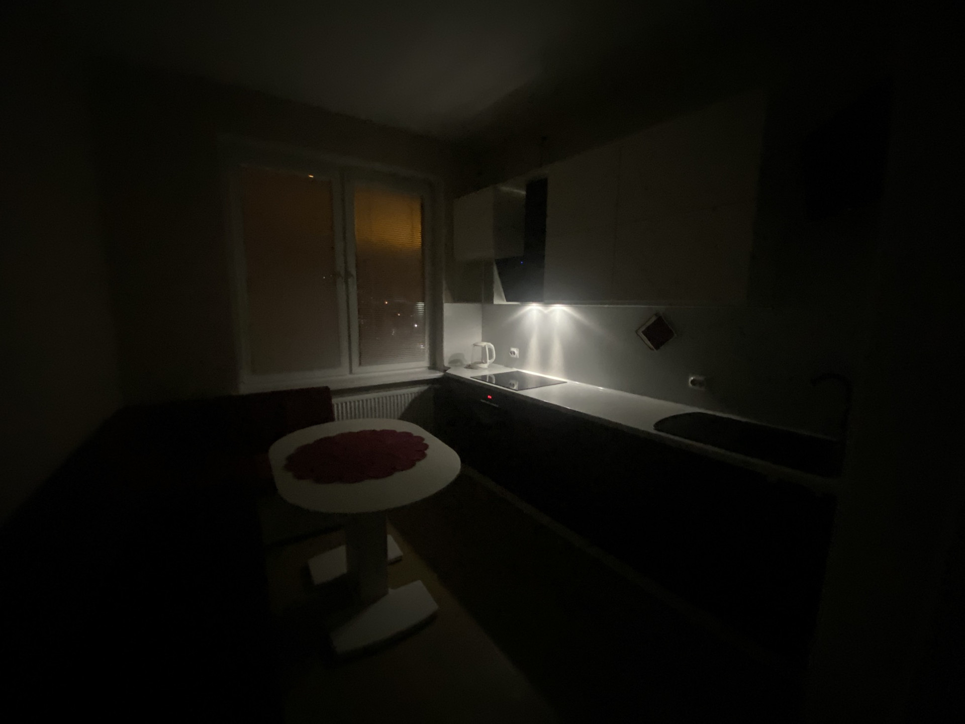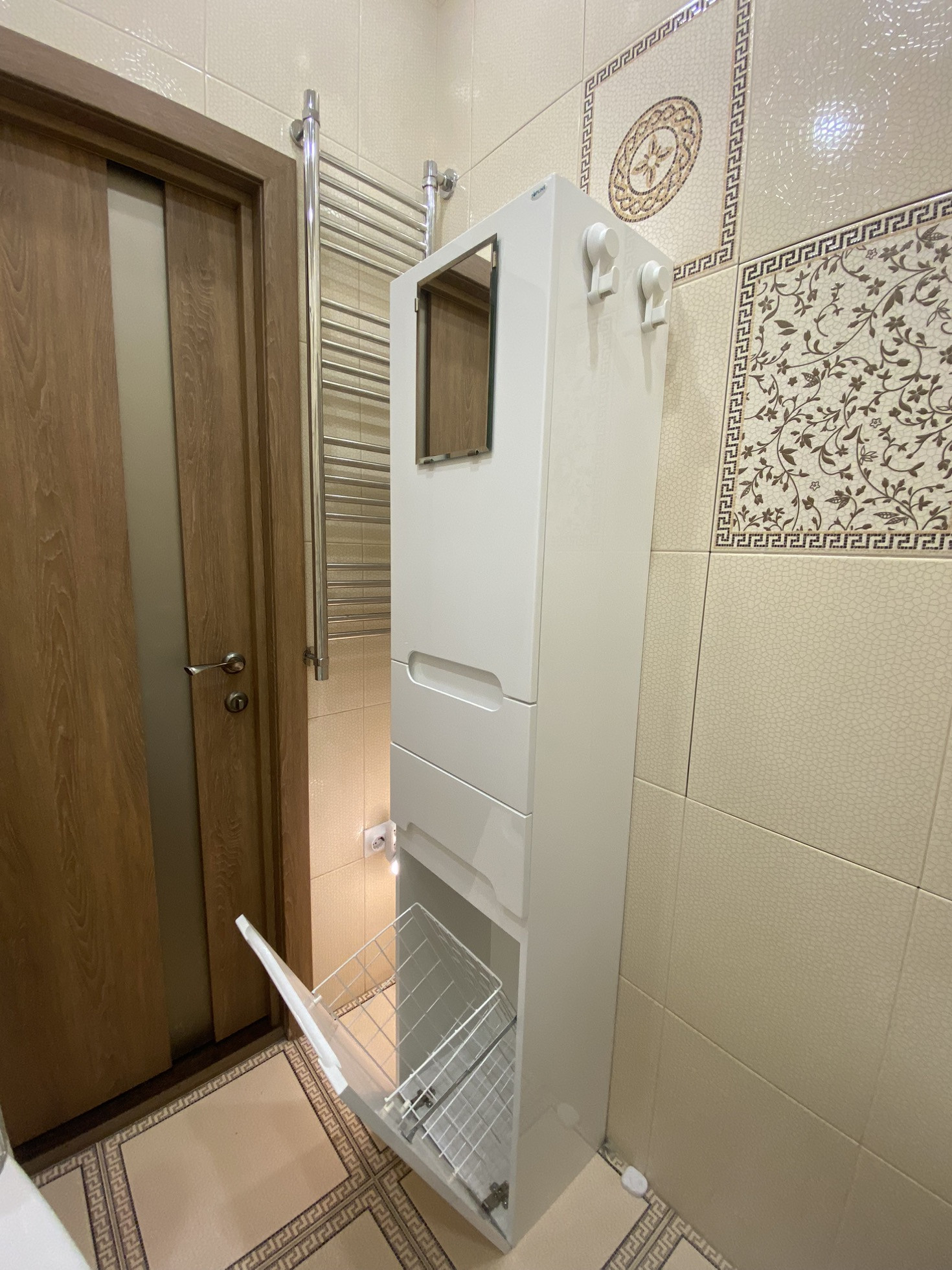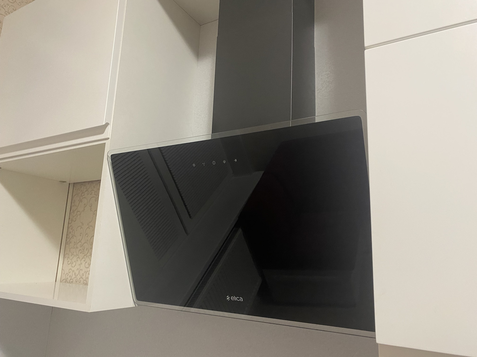 Есть дополнительный вывод под раковину, но, за ненадобностью, он закрыт шкафчиком с корзиной для белья. Вытяжка от освещения, с возможностью местного управления.