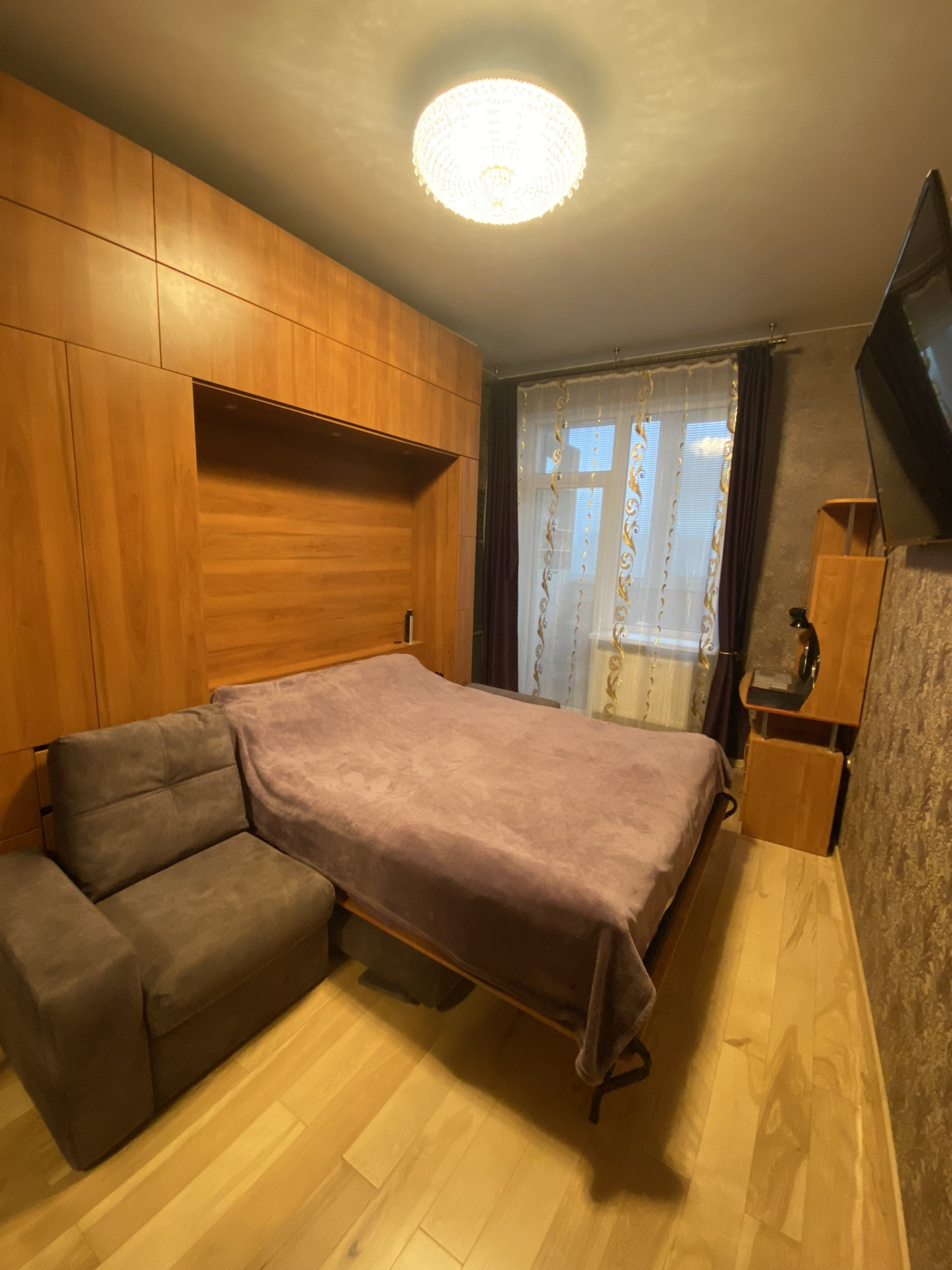 Комната обустроена немецкой мебелью с элементами модульной конструкции, благодаря чему Вы можете создавать пространство комнаты на свой вкус, и огромным местом для хранения вещей. Встроены разетки, в том числе для разъема usb. Предусмотрено интегрированное освещение - управление с пульта. Подъемная кровать с ортопедическим матрасом проста в использовании. Комфорт комнаты дополняют шторы black-out.