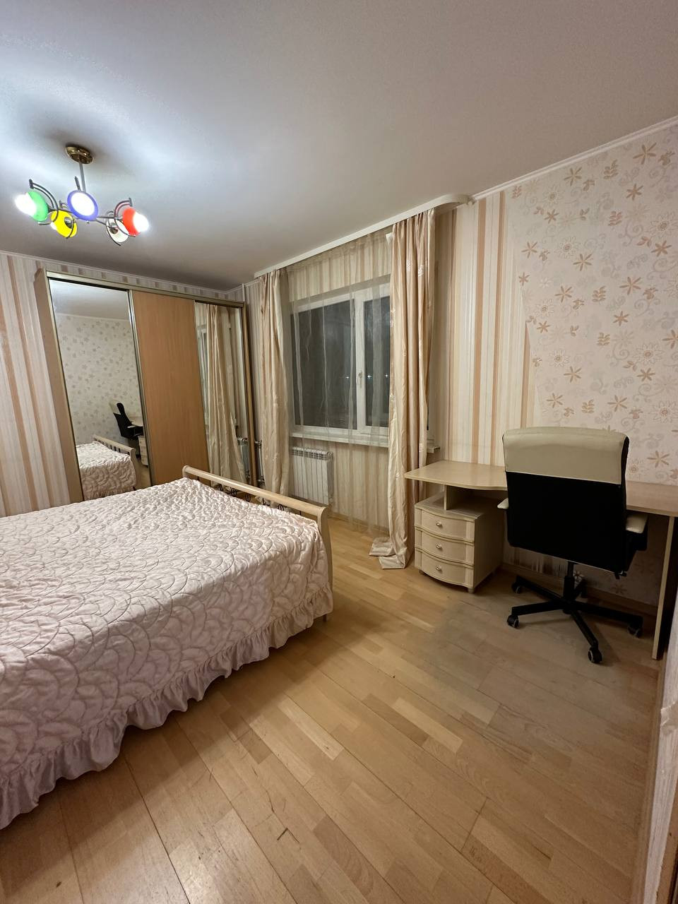 Полы - паркетная доска, потолки - натяжные, на кухне, в ванной-туалете и гостиной - свежий ремонт. Имеется лоджия с видом на сад.