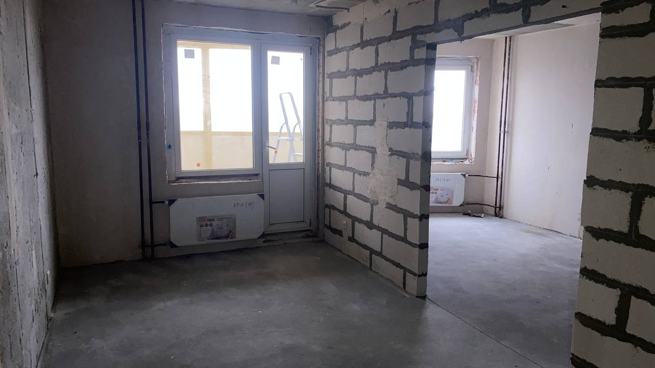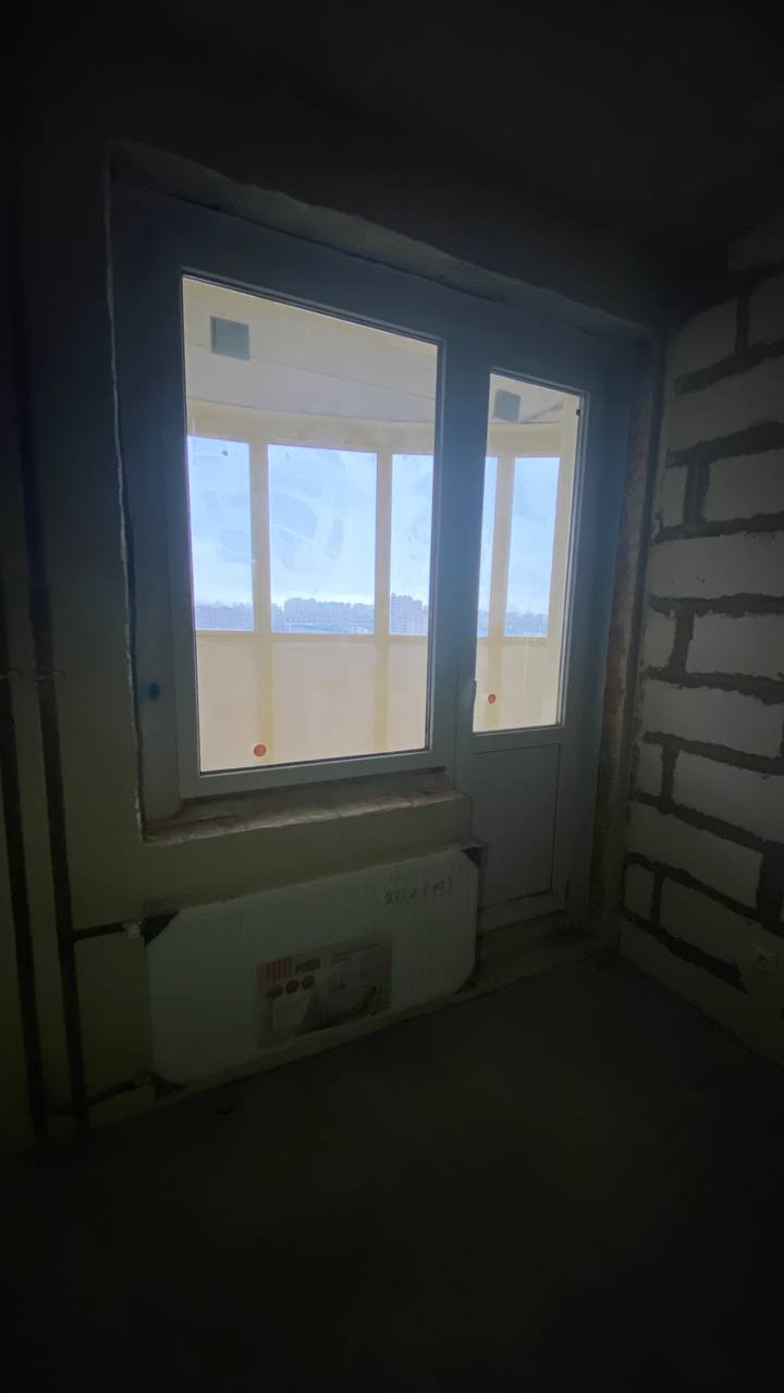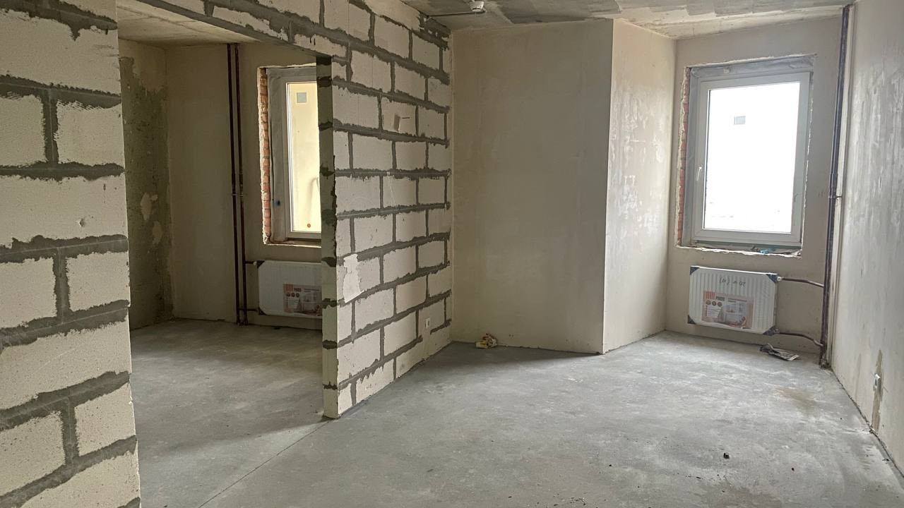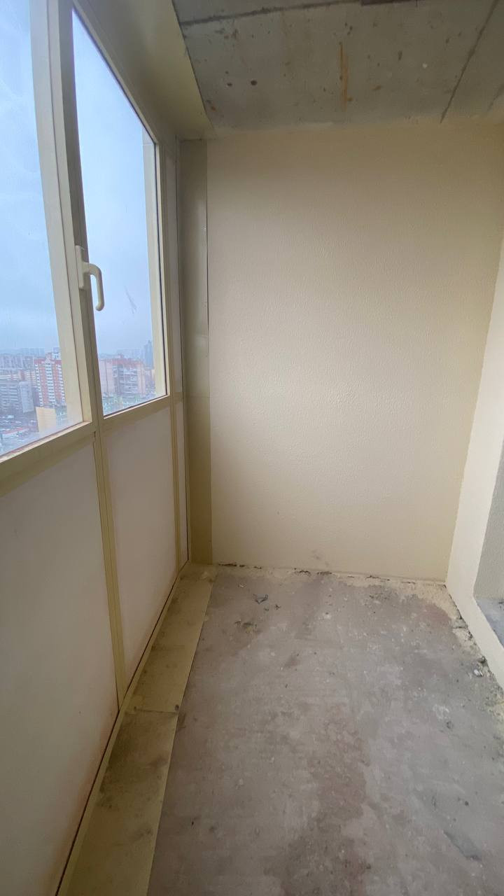 произведена стяжка пола, стены подготовлены под покраску