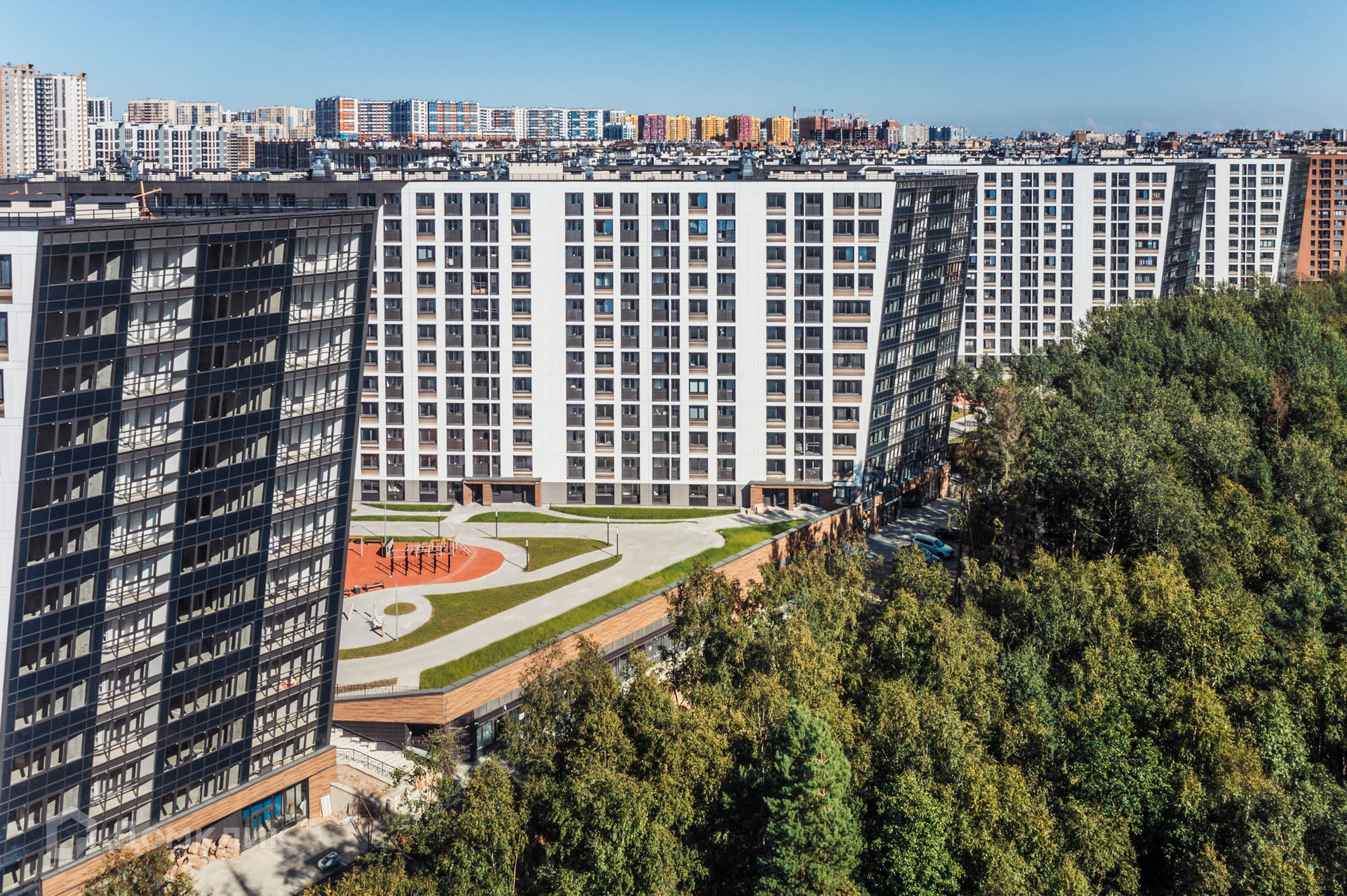 New Time состоит из семи 13-этажных корпусов с утепленными фасадами, облицованными фиброцементными панелями, которые выглядят стильно и современно. Есть квартиры с панорамным остеклением, откуда открываются живописные виды на Юнтоловский лесопарк.