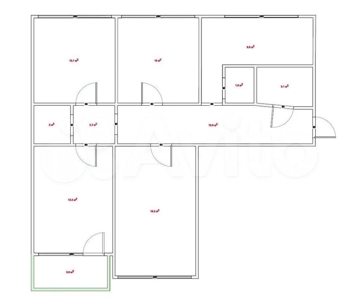 Просторная квартира 77.7 м2, 4 изолированные комнаты: 17.6 м2,15.2 м2, 10 м2, 12.2 м2 с лоджией 3.5 м2, 2 сан. узла, кухня 10.1м2, прихожая 9.2 м2, гардеробная комната.