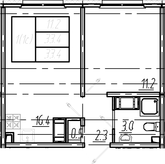 Общая площадь 33.4 м2
