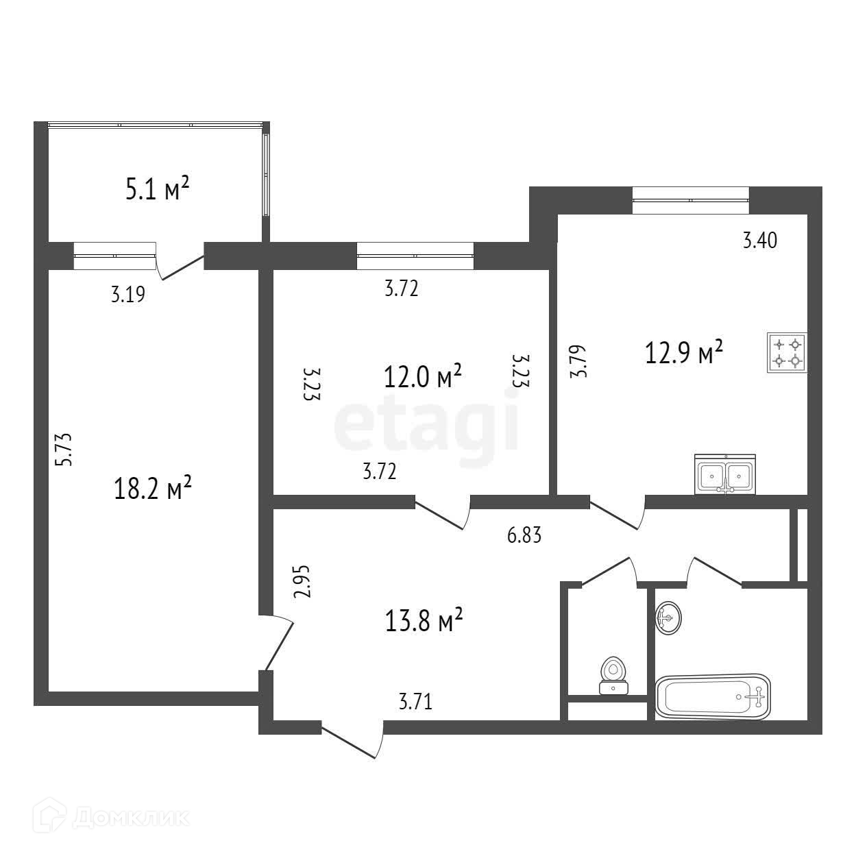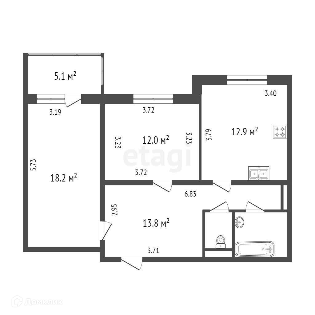 Общая площадь 62.9 м2