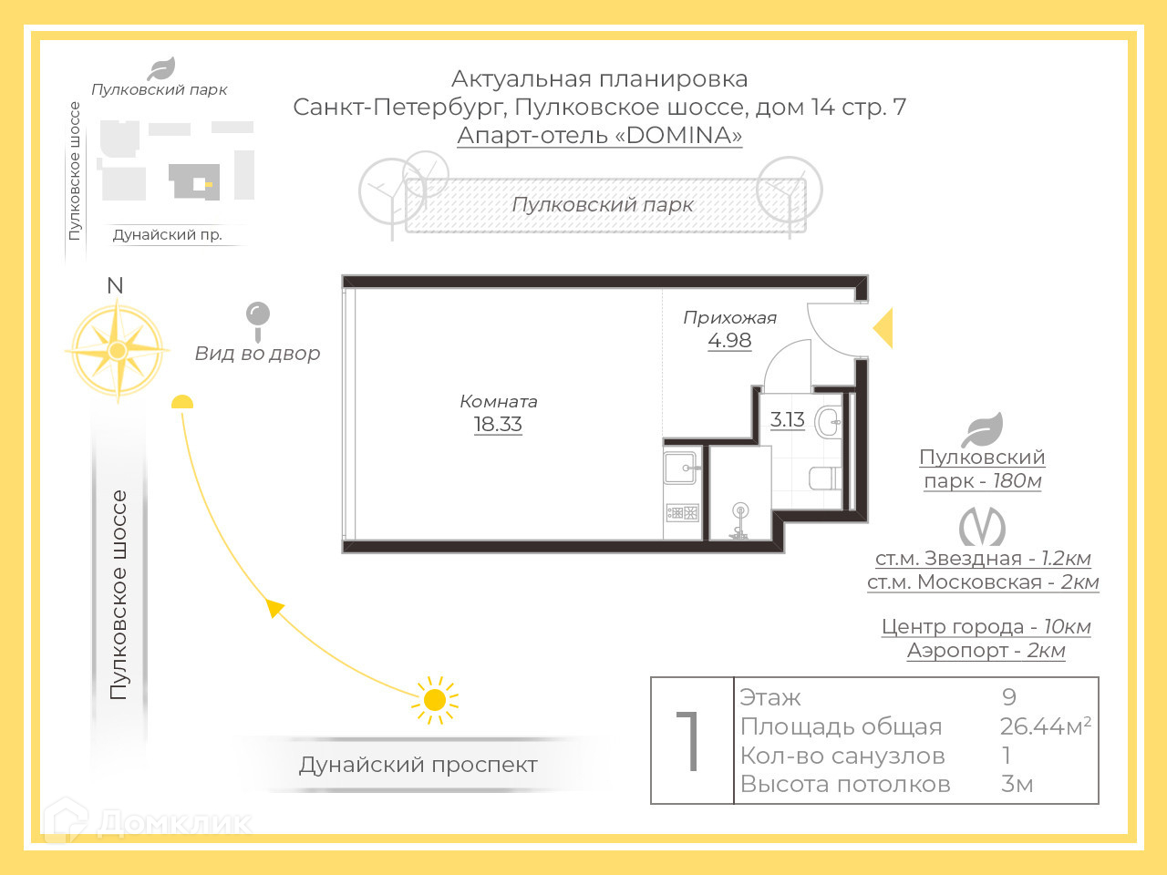 Объект расположен в статусной части Московского района Санкт-Петербурга — на Пулковском шоссе у южной границы Пулковского парка. Благоприятное окружение и великолепная транспортная доступность обеспечивает высокую заполняемость Апарт-отеля независимо от сезона и макроэкономической ситуации.